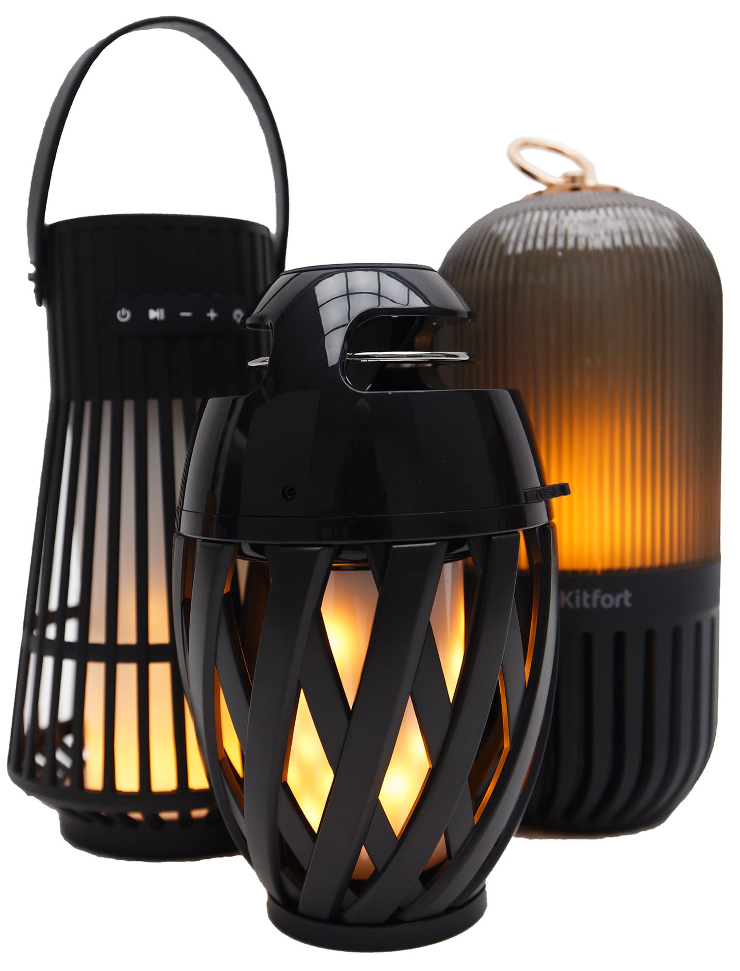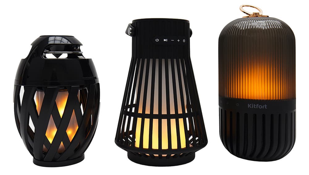 Kitfort КТ-3337, КТ-3338 и КТ-3339 выглядят совершенно по-разному, но имеют ряд идентичных или близких черт — небольшой размер, портативность и емкий аккумулятор, теплый свет ночника, одинаковые кнопки панели управления и динамики колонок. Свет внутри них «колышется», как от живого пламени, а подключение по Bluetooth к любому устройству с музыкой дает возможность насладиться хорошим и даже громким звучанием.