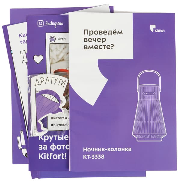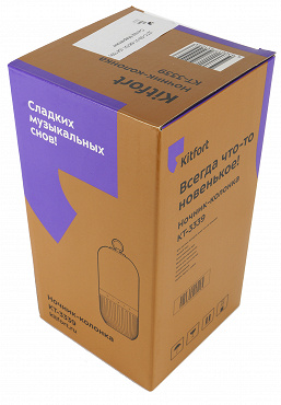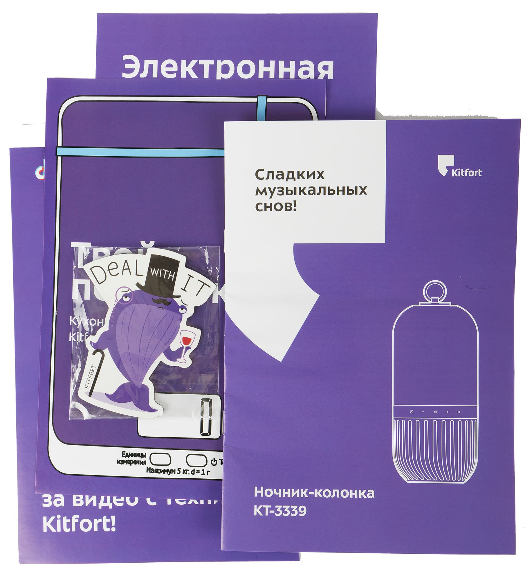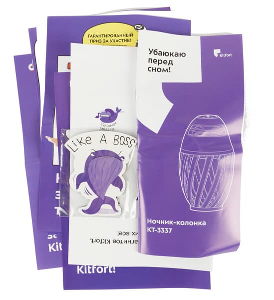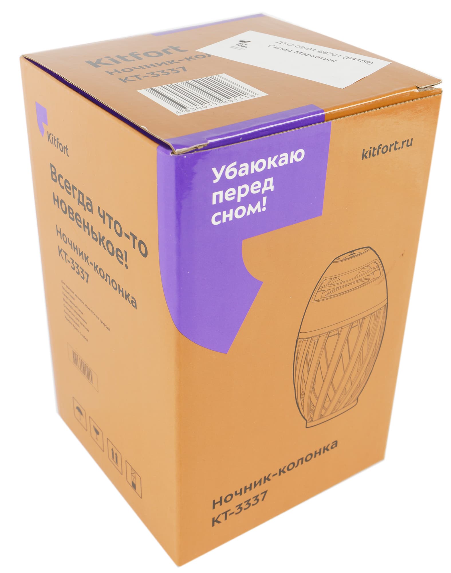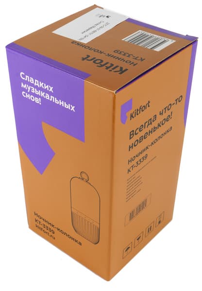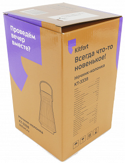 Kitfort KT-3337, KT-3338 и KT-3339 поставляются в фирменных картонных упаковках с глянцевым покрытием. На лицевых сторонах коробок нанесены векторные изображения устройств, а также их наименований, адрес сайта производителя и обязательный слоган — свой для каждой лампы. И все они весьма приятные: «Убаюкаю перед сном!», «Проведем вечер вместе?», «Сладких музыкальных снов!».