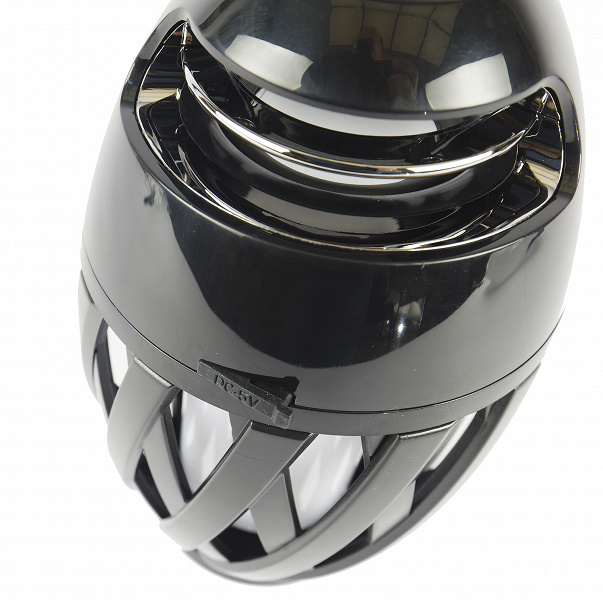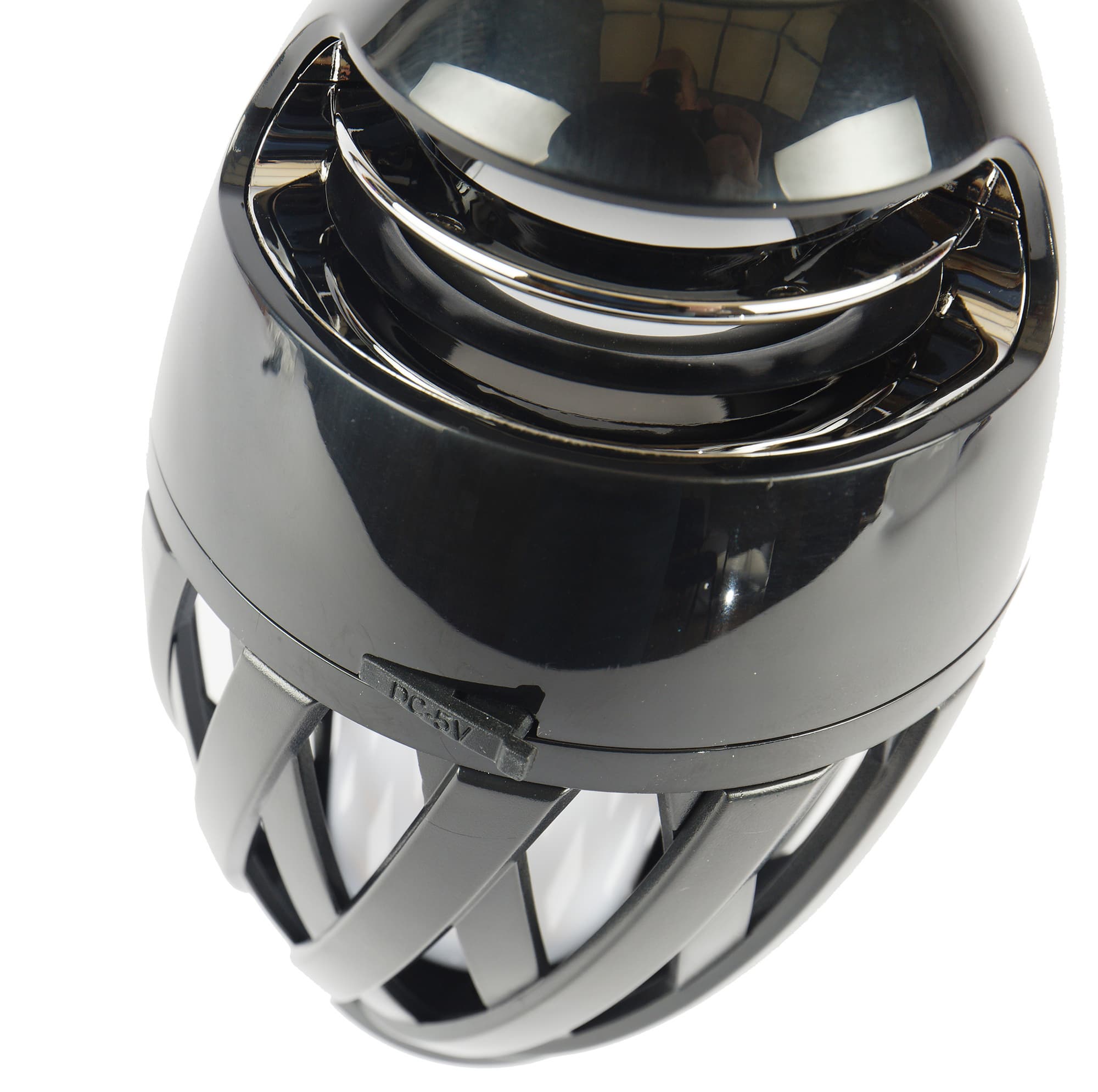 Весь корпус сделан из черного глянцевого пластика сверху и матового в нижней части. В верхней части имеются отверстия, имитирующие решетку как у газового обогревателя и в данном случае они сделаны для динамика, расположенного под ними. Внизу пластиковые детали образуют сетку, создающую узор вокруг лампы во время ее работы, а также защищающую лампочку.