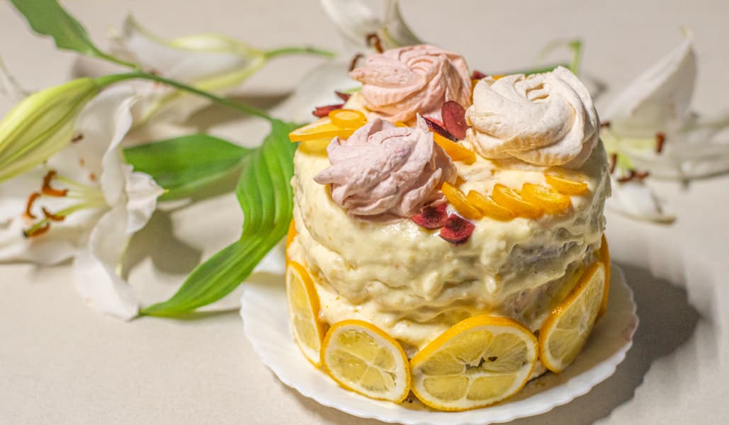 Получившийся бисквит мы разрезали на коржи и использовали в качестве основы. Для крема использовали лимонный курд и украсили зефиром ручной работы.