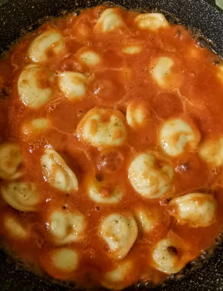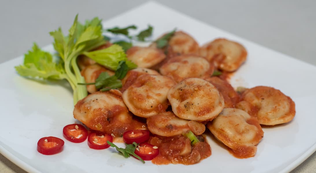 Пельмени залили измельченными томатами со специями и довели до готовности.