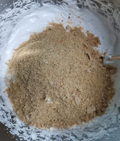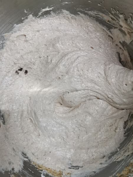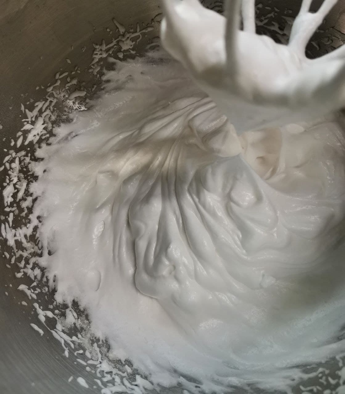 Увы, смесь не взбилась до нужного состояния, но мы не отчаялись, а добавили туда еще муки, размешали и выложили в другую емкость.