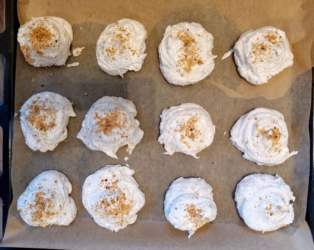 На противень выложили меренги произвольного размера, сверху посыпали крупно измельченными орехами.