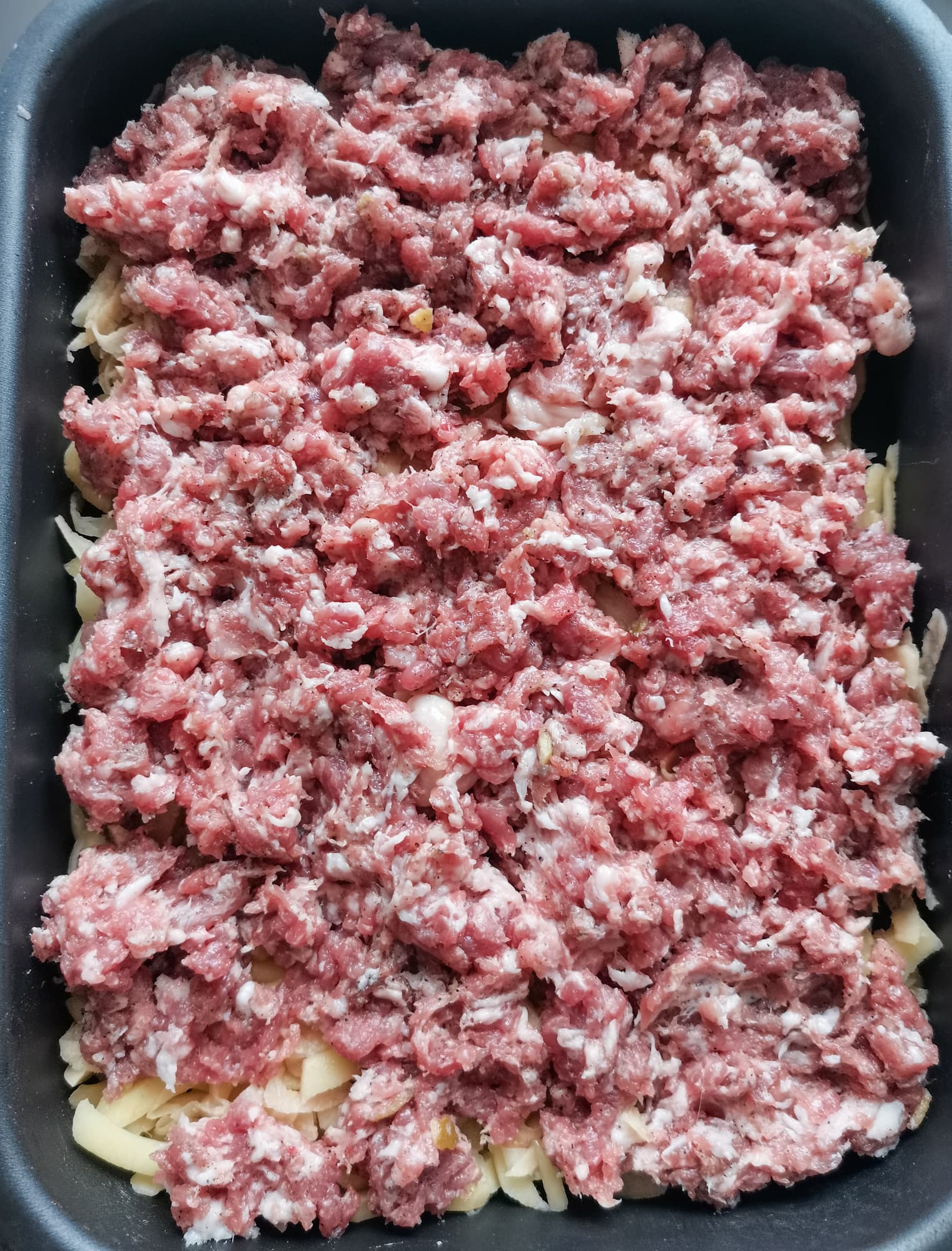 Из картофельных слайсов, сыра и фарша мы решили сделать запеканку. В форму уложили подготовленную картошку, сверху фарш со специями.