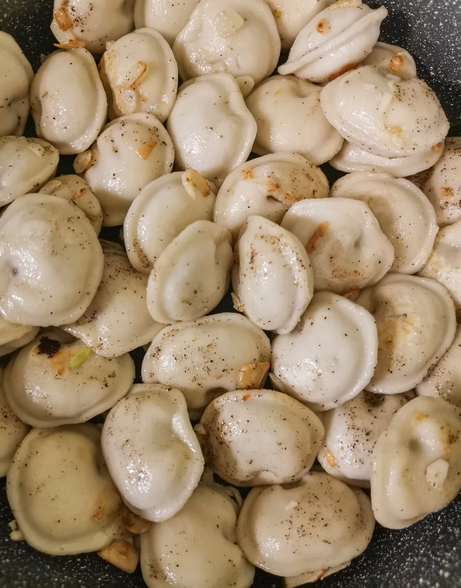 В получившуюся массу мы добавили сельдерей, специи, соль и масло, взбили блендером в течение 1 минуты. На сковородку выложили сваренные до полуготовности пельмени, обжарили их с чесноком.