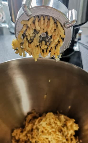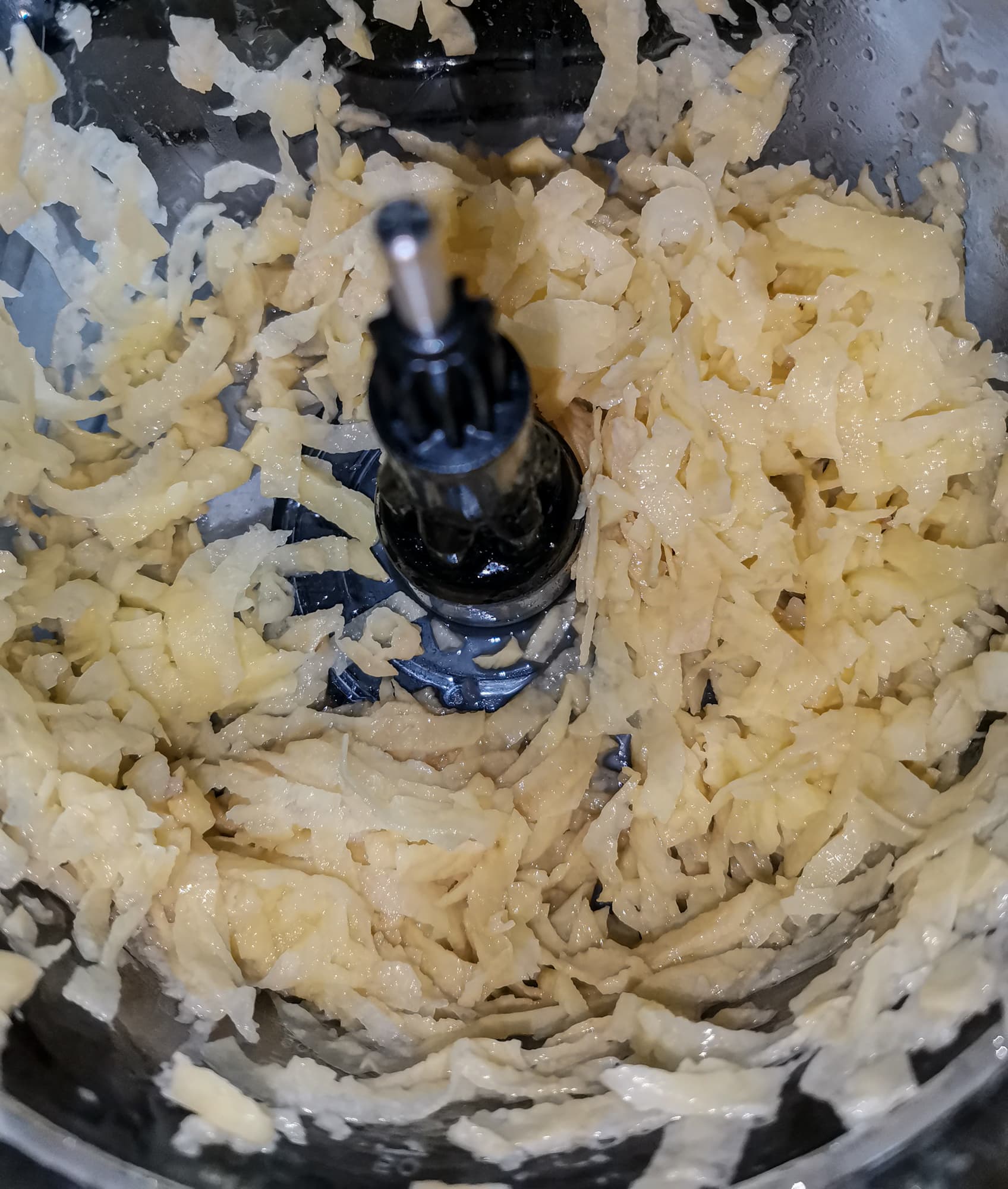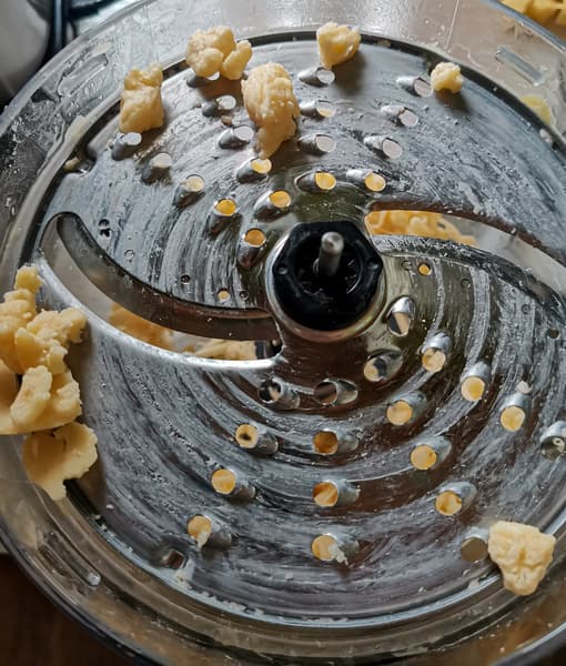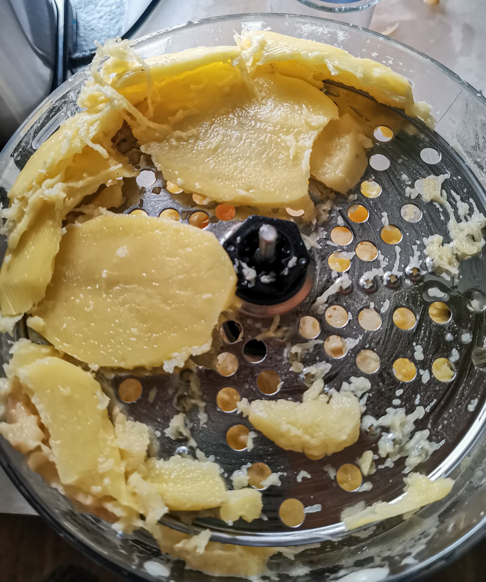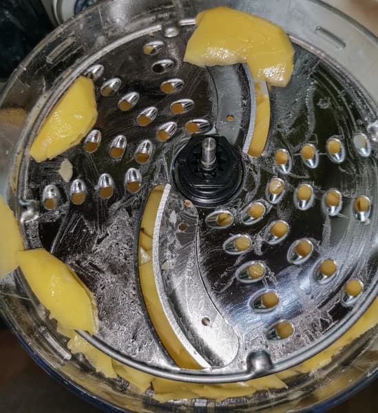 Из минусов процесса — только большое количество кусков, оставшихся сверху диска. Их невозможно подать на диск толкателем и они мешают тереть следующии куски картошки.