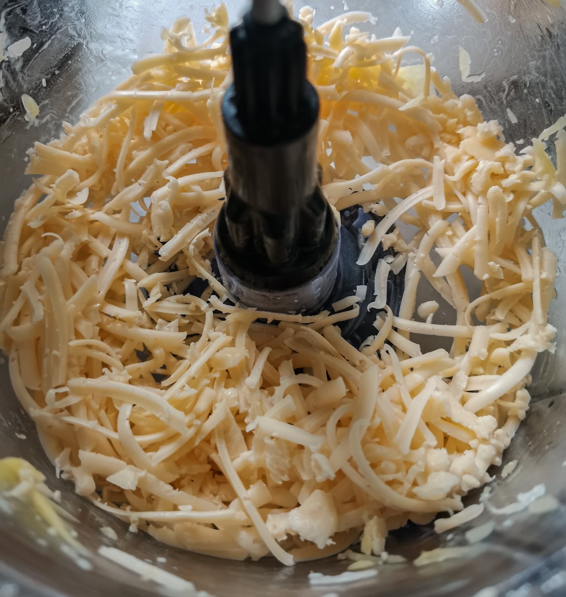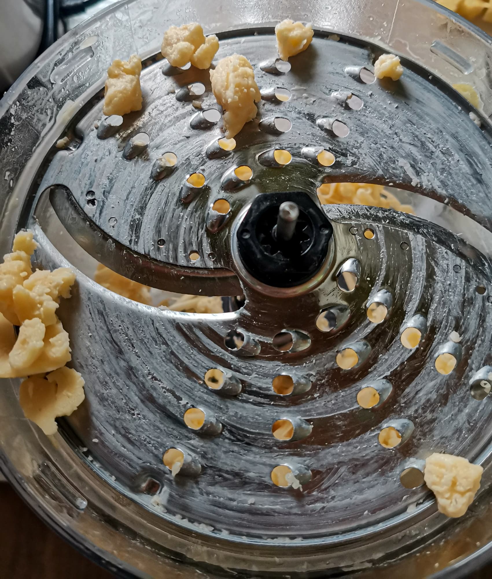 Наше знакомство с возможностями насадки-комбайна мы начали с банального натирания российского сыра на средней терке. Сыр натерся неплохо, сверху диска осталось только несколько комочков.