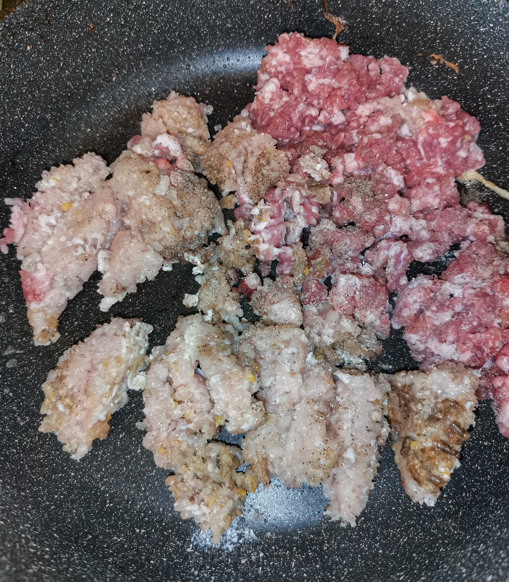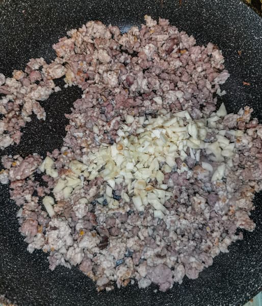 Фарш поджарили со специями и чесноком.