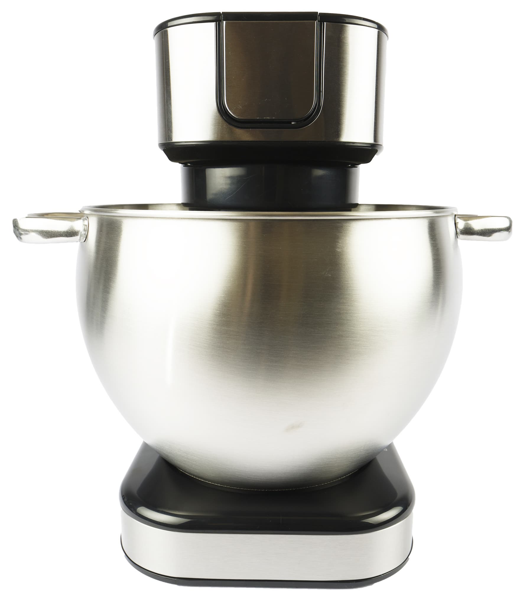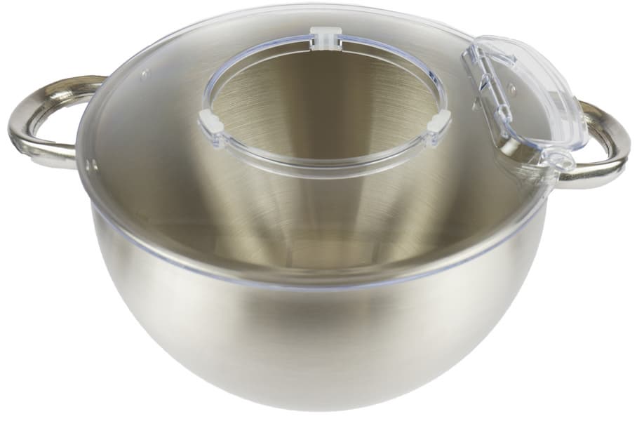 Чаша планетарника объемом 10 литров, изготовлена из толстой нержавейки с припаянными большими удобными ручками. Она вставляется в посадочное отверстие и фиксируется поворотом. Крышка чаши сделана из прозрачного пластика и имеет загрузочное отверстие для добавления продуктов в процессе готовки. Крышка надевается и фиксируется на моторном блоке.