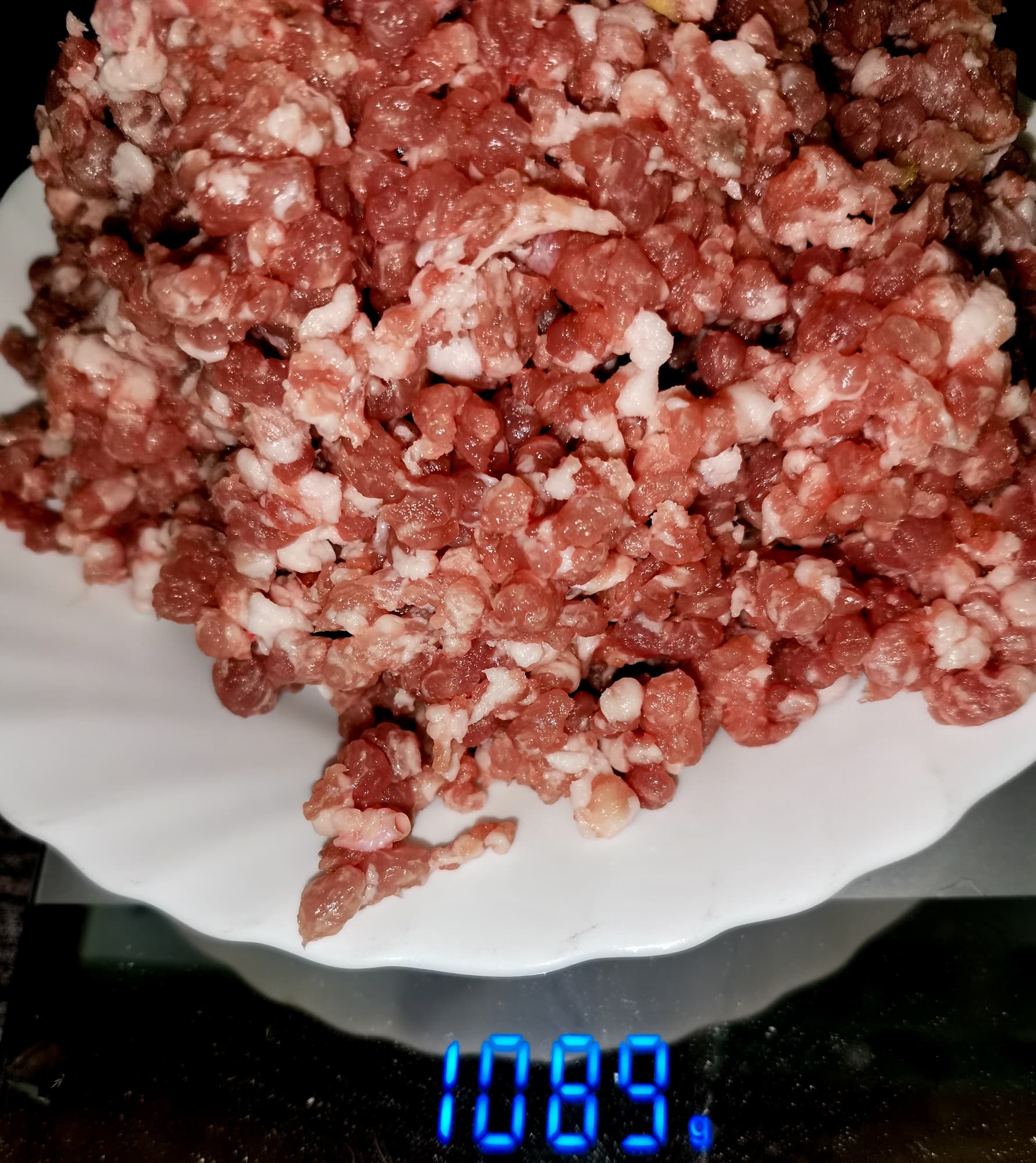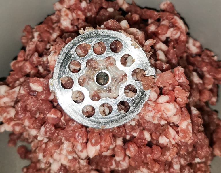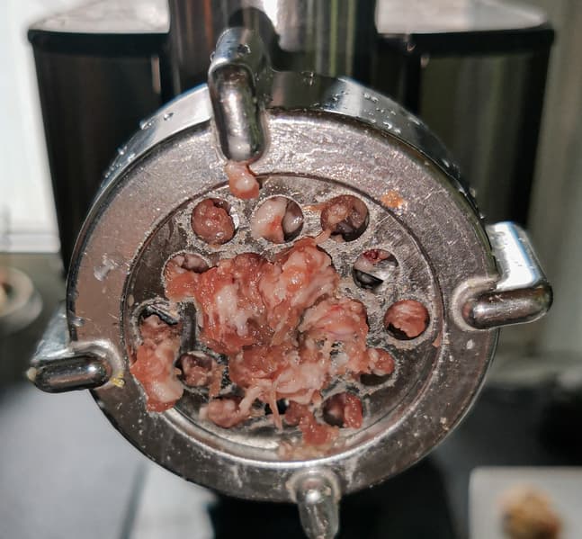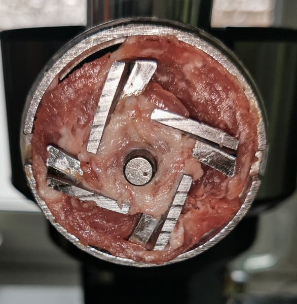 Прокручивали в мясорубке на 5-й скорости, быстро подавая мясо к шнеку, но не давя на него толкателем. За 1 минуту работы прибора мы смогли получить 1,09 кг фарша, что является хорошим результатом для мясорубок, и уж тем более для устройств, у которых мясорубка — лишь дополнительный аксессуар. Мясо не давилось, а рубилось.