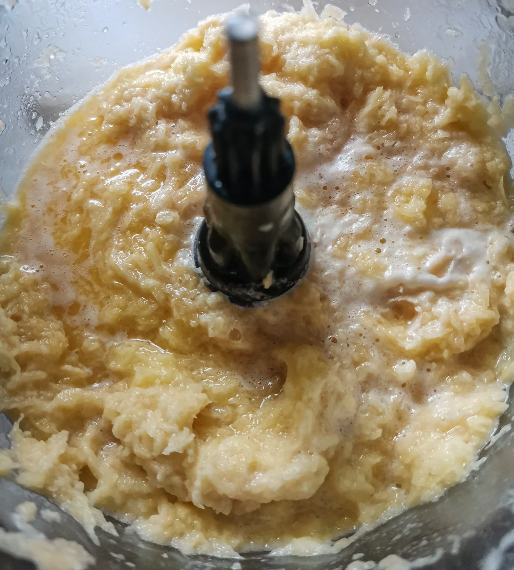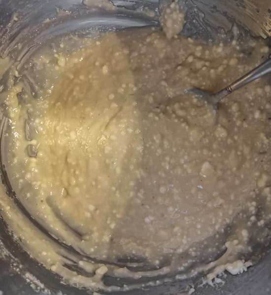 Мешали венчиком около 5 минут на 5-й скорости. Бананы полностью измельчились и смешались с тестом, а творог так и остался зерном.