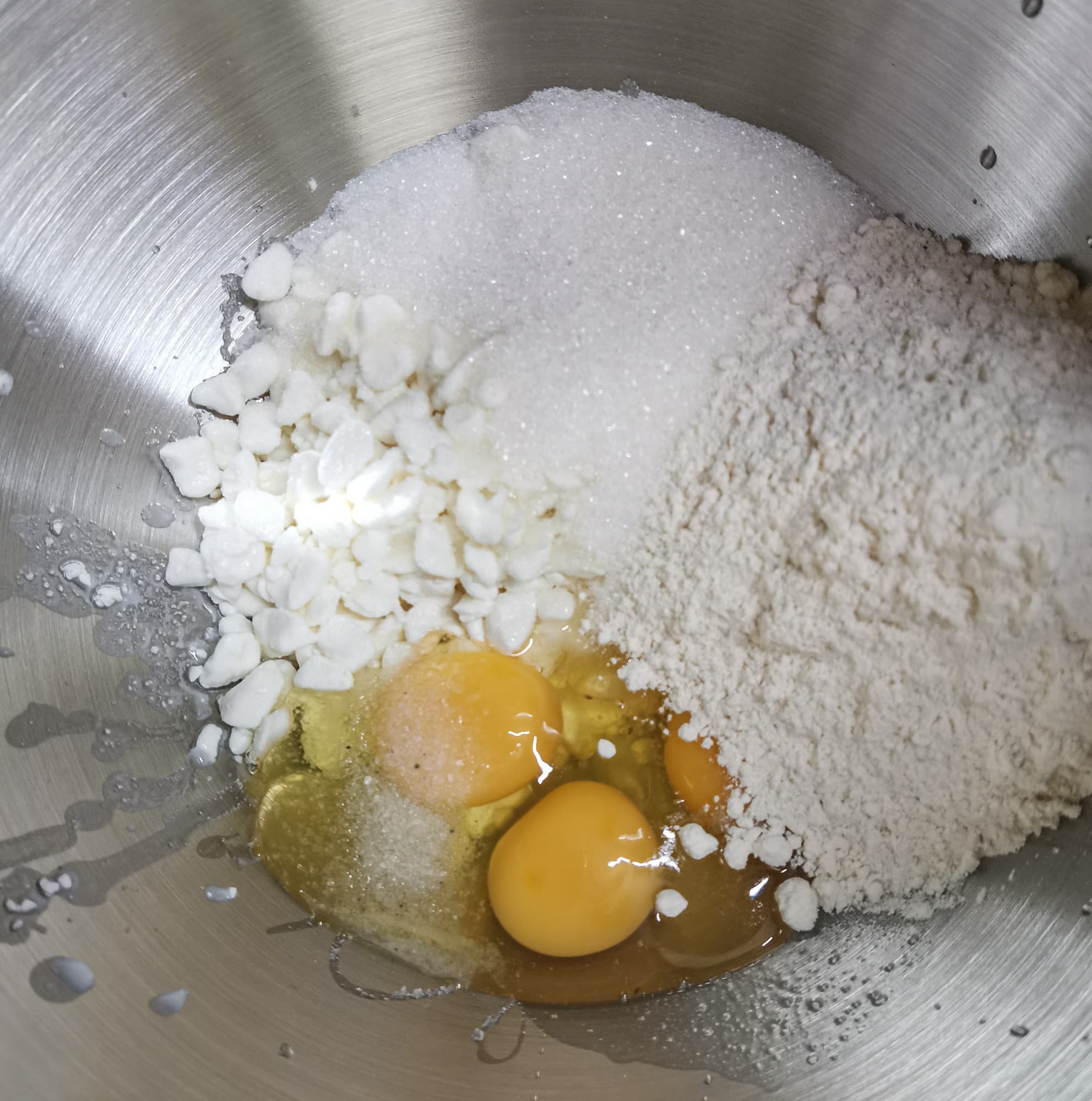 То, что миксер отлично взбивает белки с сахаром, мы выяснили. Теперь решили проверить, как он будет смешивать тесто из разных ингредиентов. В чашу загрузили зерненый творог, муку, яйца, сахар, немного молока. Перемешивали венчиком на средних скоростях.