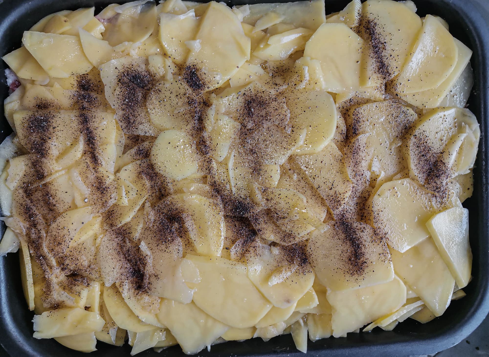 На фарш еще ряд картошки, перец и сыр.