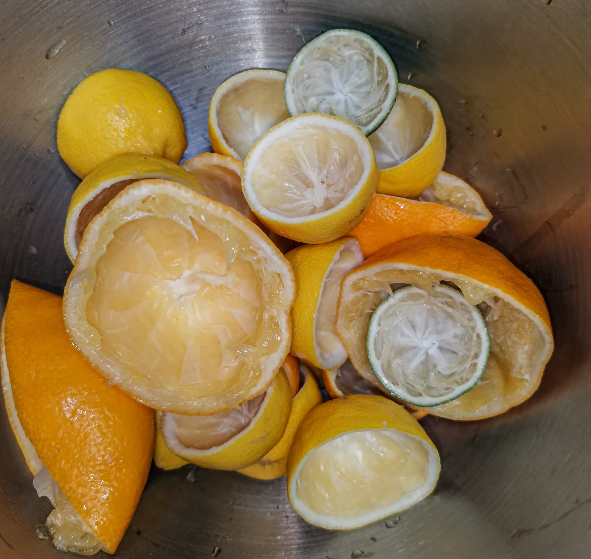 С помощью соковыжималки для цитрусовых отжали сок. Кожуру отварили в течении пары минут. Отваренные половинки разрезали еще пополам (крупные — на несколько кусков) и прокрутили в мясорубке. Кожура отлично подхватывалась валом, даже не нужно было проталкивать толкателем. Рубилась довольно быстро.