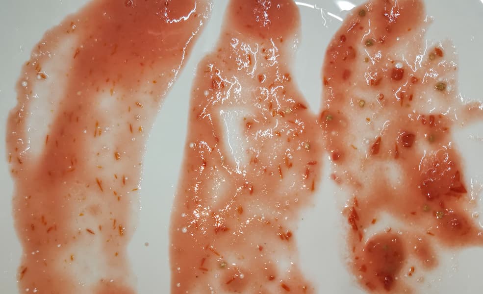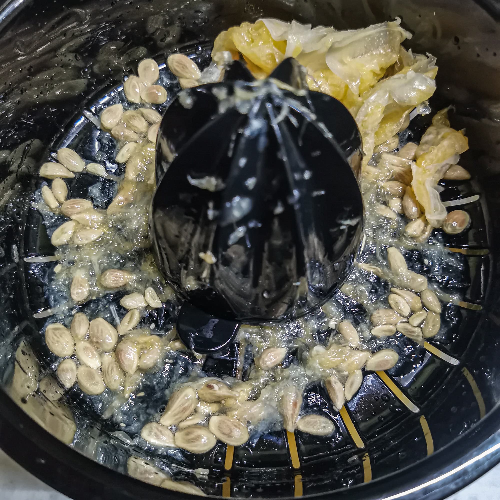 При измельчении в течение 30 секунд в смеси остаются крупные кусочки кожуры и неперемолотые семена, после 1 минуты измельчение среднее, через 2 минуты крупных фракций уже не встречается, хотя кусочки кожуры все еще заметны.