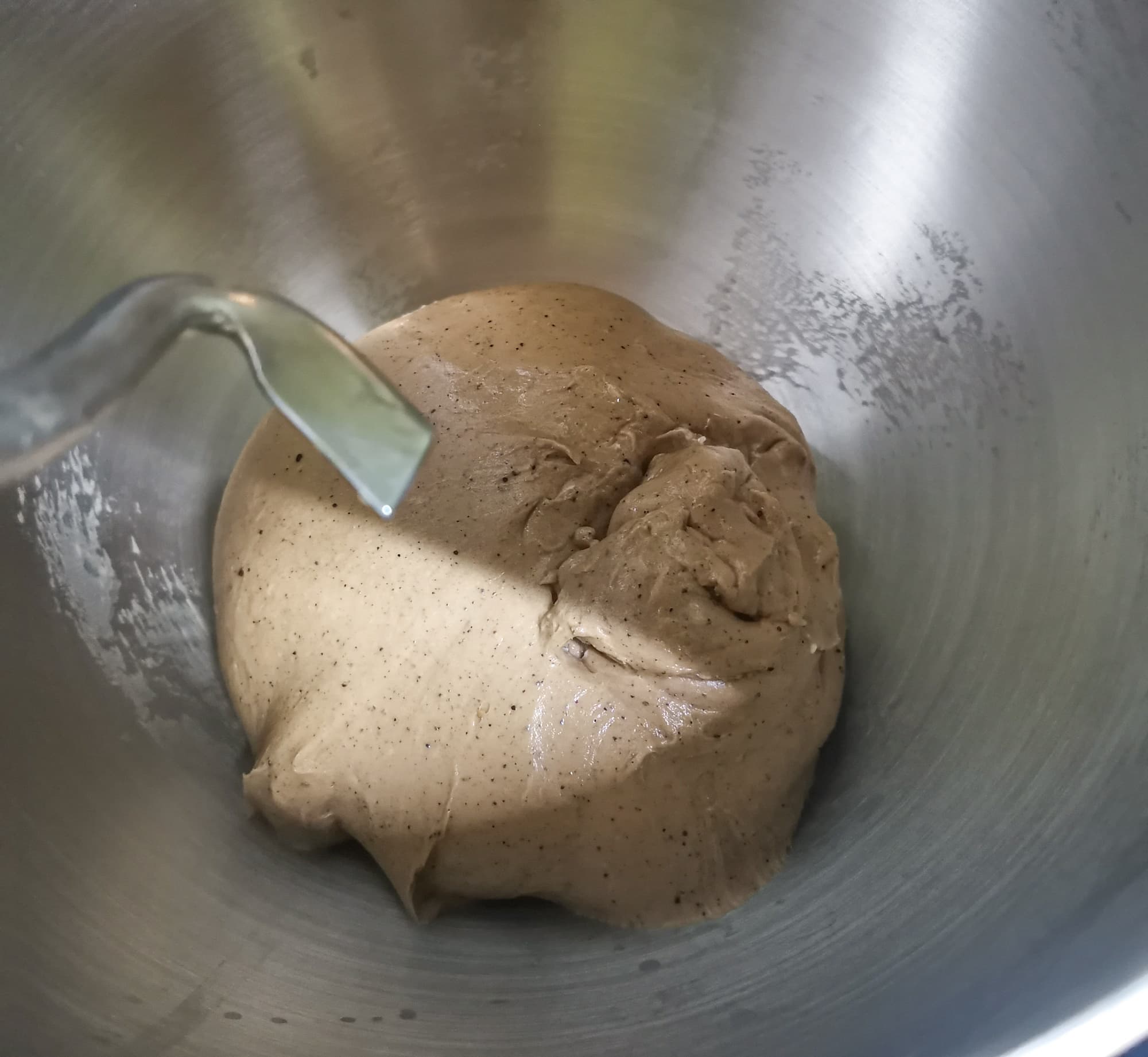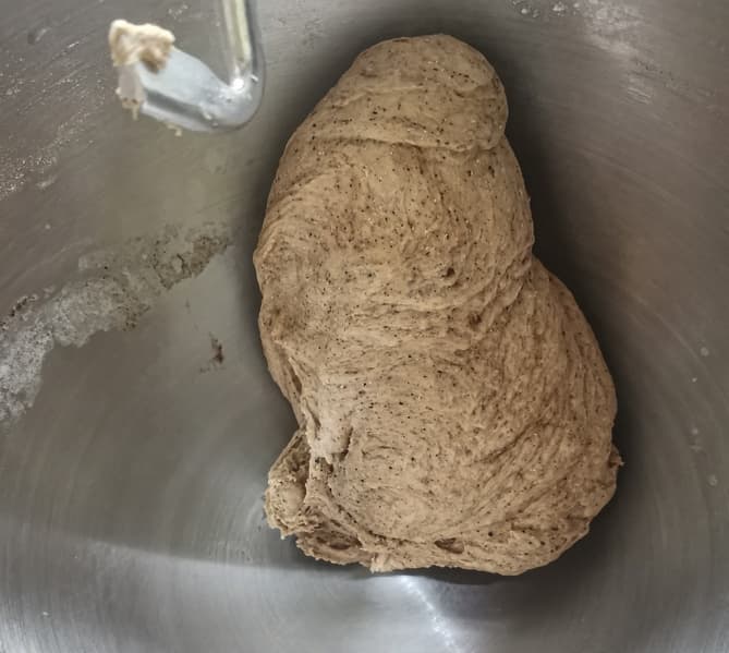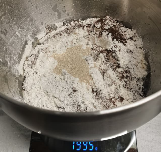 Точные пропорции для белого хлеба мы взяли из сборника рецептов Kitfort для хлебопечки. Единственным изменением было то, что мы заменили 30 г муки на 30 г солода и добавили 2 г смеси корицы с имбирем и бадьяном. Все ингредиенты загрузили в чашу и мешали крюком для теста в течение 15-20 минут.