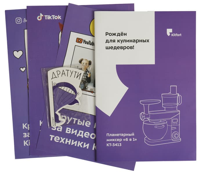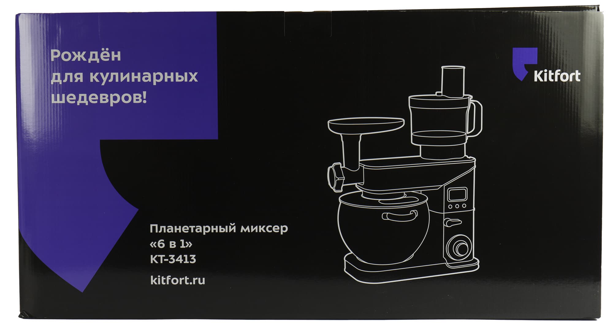 Планетарный миксер прибыл на тестирование в огромной глянцевой упаковочная коробке Kitfort, выполненной в черно-фиолетовой гамме с белыми надписями — названием модели, ее техническими характеристиками и особенностями, а также рекламными слоганами фирмы производителя. Ручек или прорезей для удобства переноски на коробке нет.