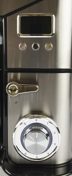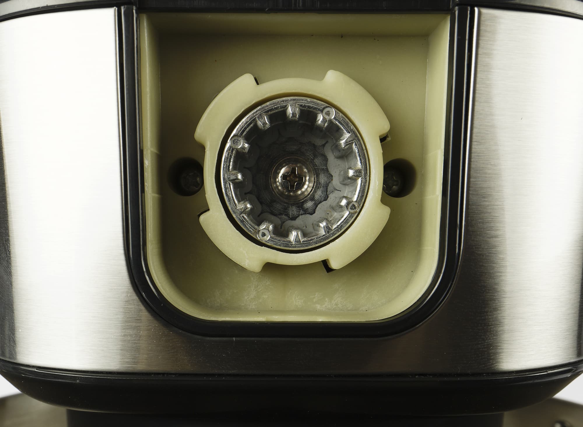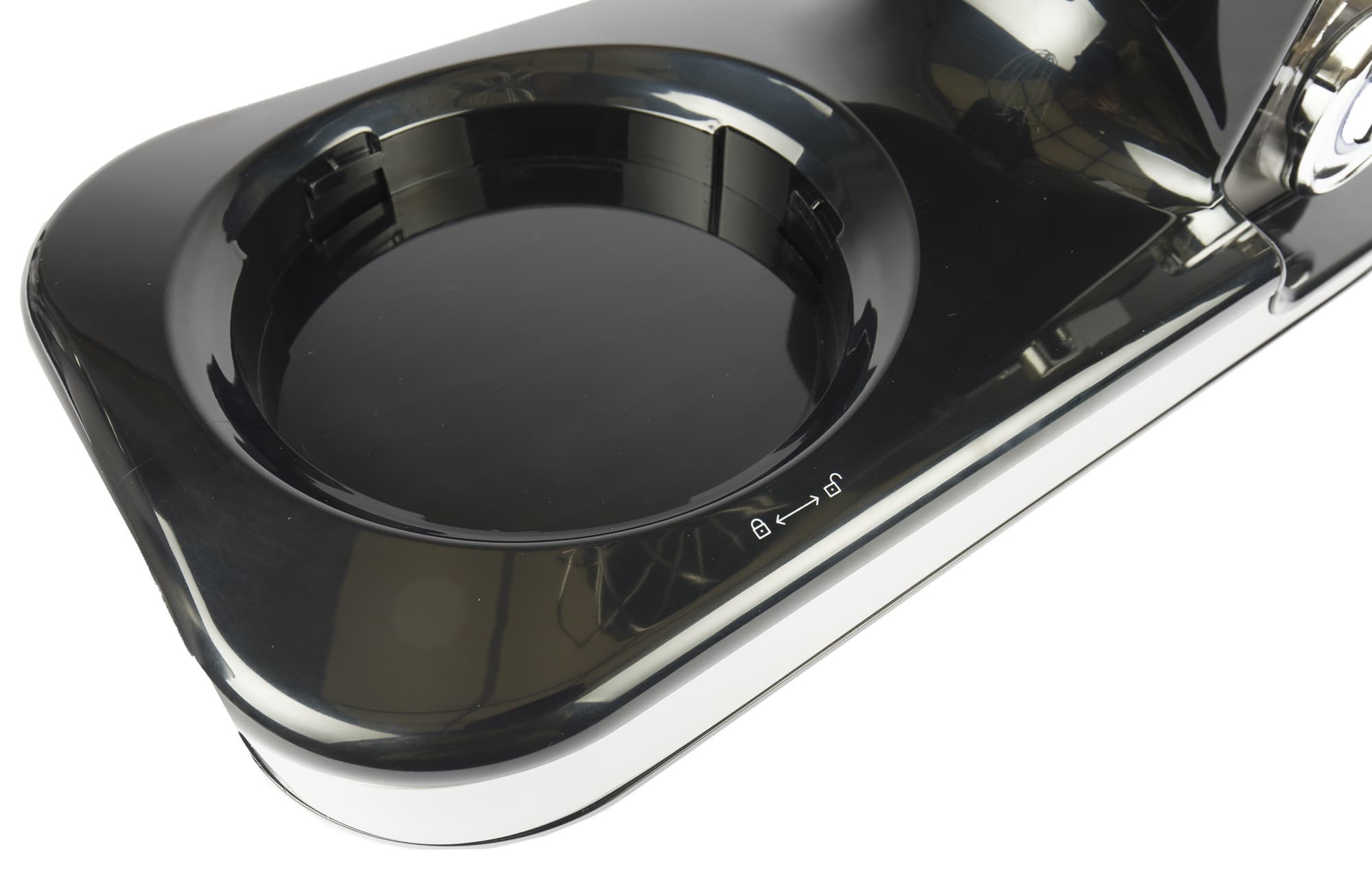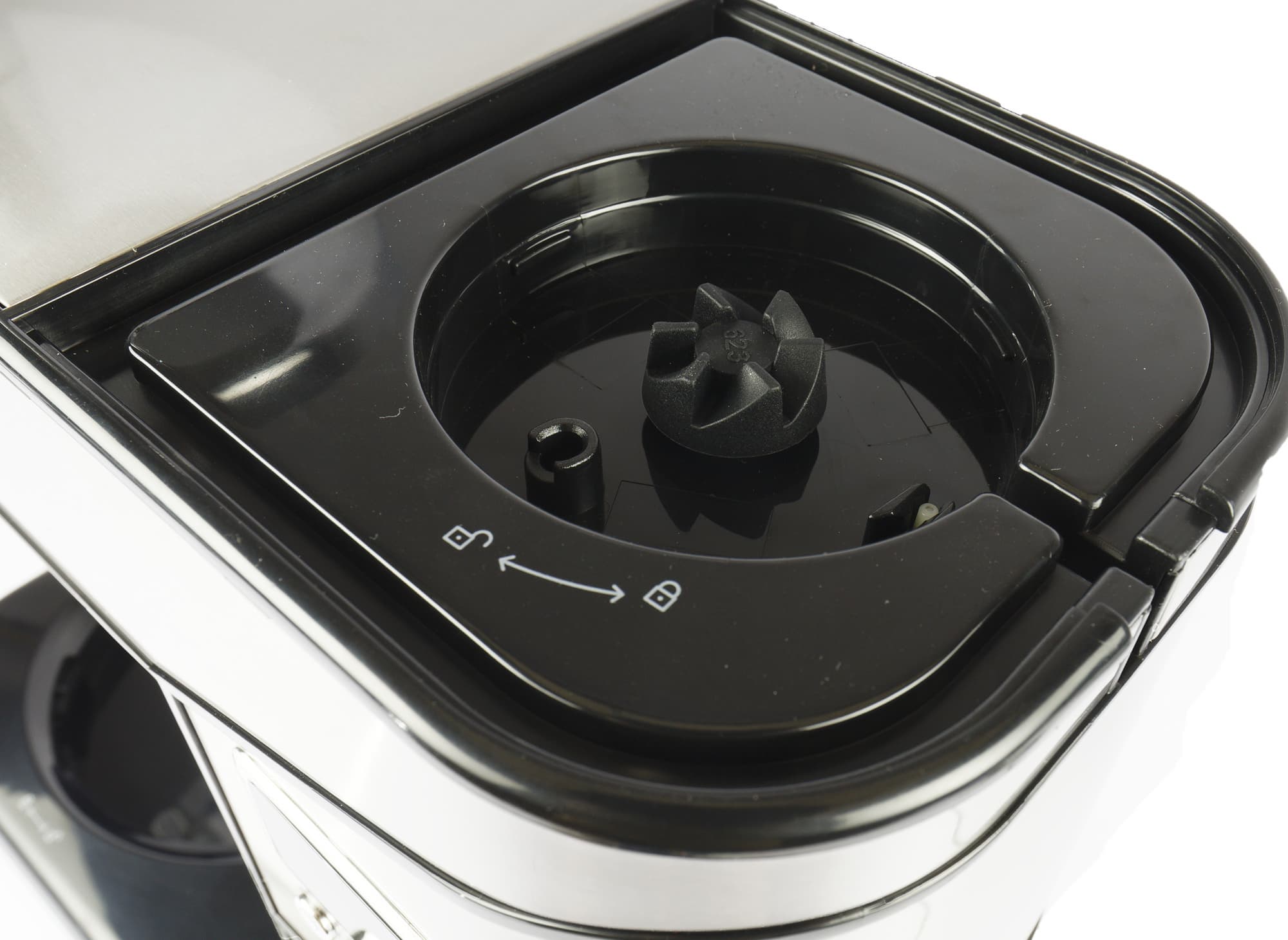 На редуктор ставится чаша и фиксируется поворотом. Чаша без установленной и зафиксированной на ней крышки работать не будет. Крышка должна быть заблокирована в единственном положении — когда ее носик находится над ручкой чаши.