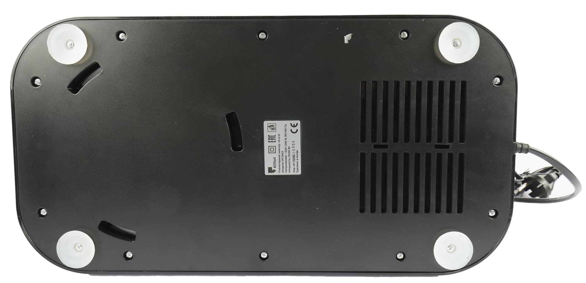 Миксер установлен на 4 большие ножки с мягкими присосками, однако к керамической фактурной столешнице они присосаться не смогли. Наклейка с номером и техническими данными, а также прорези вентиляции располагаются снизу.