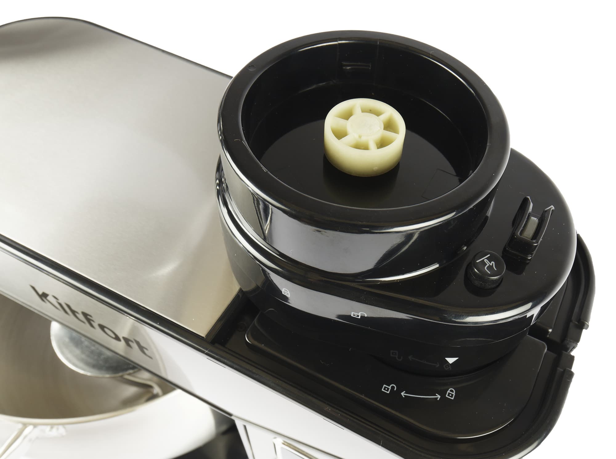 Для того, чтобы установить редуктор на моторный блок, нужно правильно вставить его в гнездо и зафиксировать поворотом против часовой стрелки, нажав кнопку блокировки на редукторе сверху. Если редуктор вставлен неверно или не зафиксирован — не загорится дисплей и миксер не включится.