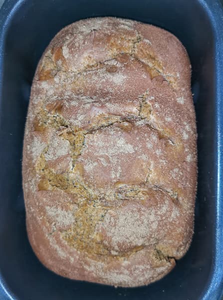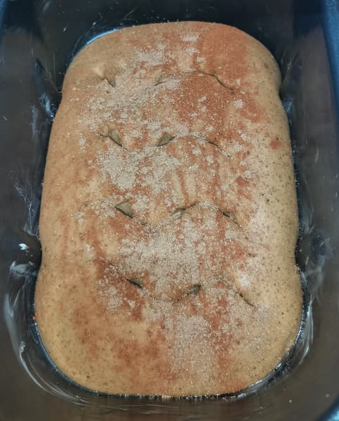 Выложили в емкость хлебопечки, посыпали корицей, поставили на расстойку. Через 2 часа загрузили в хлебопечку на режим выпечки.