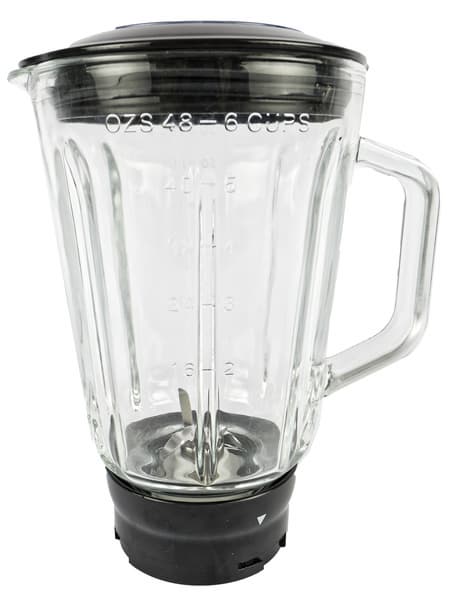 Чаша блендера емкостью 1,5 л изготовлена из толстостенного стекла с мерной шкалой на боковой поверхности, удобной литой ручкой и носиком.