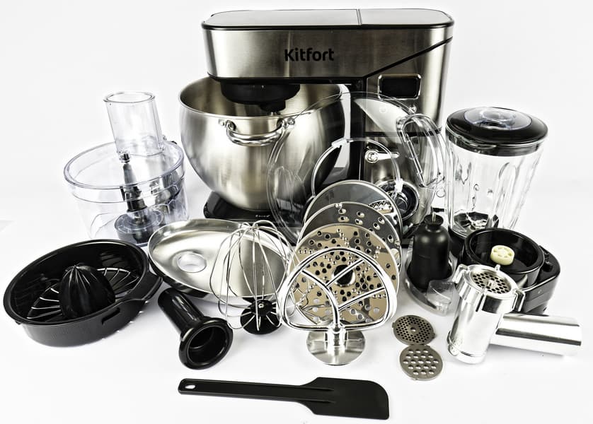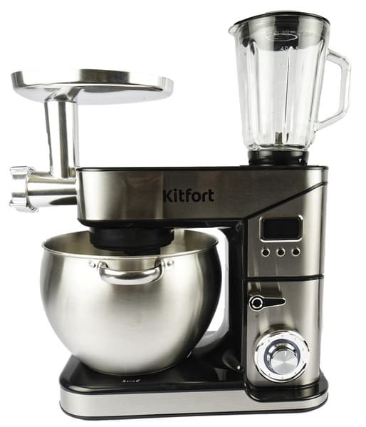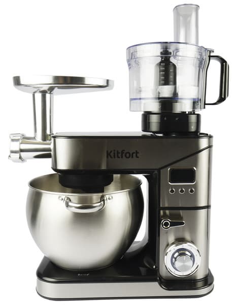 Kitfort KT-3413 представляет собой кухонный комбайн на основе планетарного миксера. Прибор включает полноценную мясорубку с достаточно высокой производительностью, кухонный измельчитель с S-образным ножом и чашей 2 л, дисковую терку с хорошо подобранными типами измельчения и высокой скоростью шинковки, соковыжималку для цитрусовых и блендер, являющийся скорее дополнением, чем самостоятельным прибором. Планетарный миксер оборудован чашей 10 литров и отлично взбивает, смешивает и вымешивает тесто.