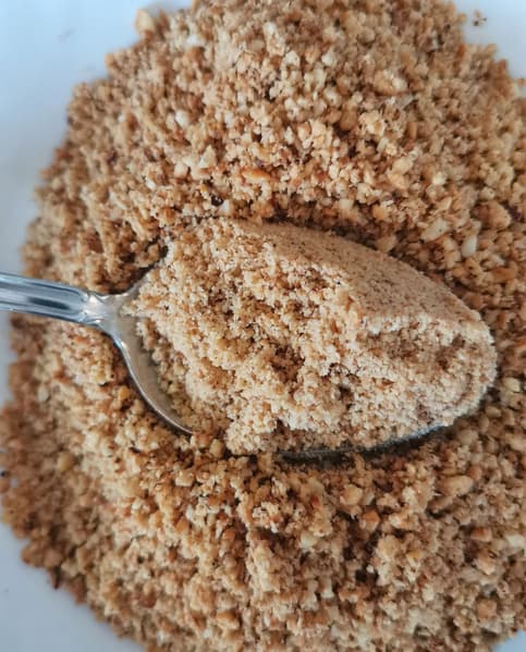 После измельчения вместе с мукой в течение еще 2-3 минут фракция орехов уменьшилась сильнее и уже отдаленно напоминала ореховую муку. Для печенья это подходило.