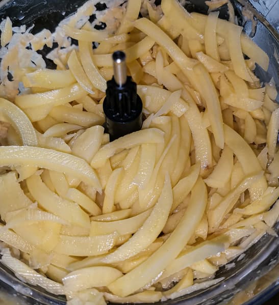 Следующим этапом мы нарезали картошку крупными ломтиками на диске-шинковке. Кусочки в массе получились аккуратные, мелких обрезков немного.