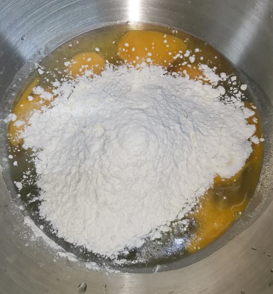 Так как домашние кондитеры чаше всего вымешивают в миксере бисквитное тесто, мы решили проверить, сможет ли наш Kitfort KT-3413 не просто сделать бисквитное тесто, а сразу взбить яйца с мукой в один прием. Мы положили в чашу яйца, муку и сахар в соответствии с рецептом и поставили миксер взбивать продукты.
