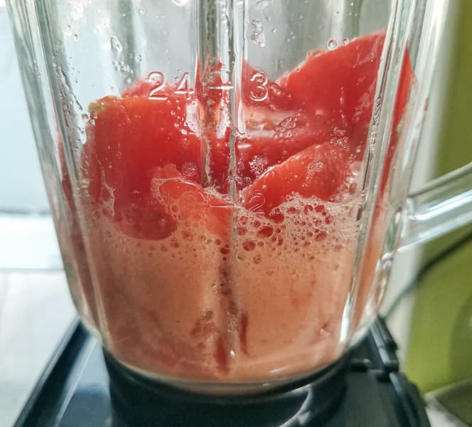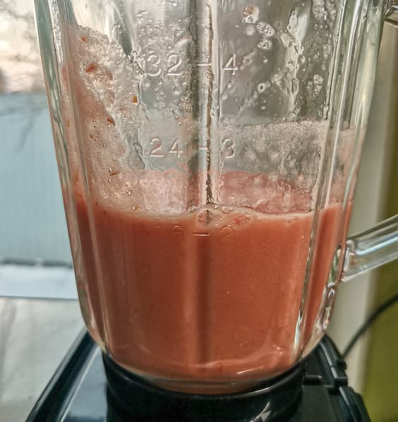 Мы измельчали томаты 30 секунд, потом еще 30 секунд, после еще 1 минуту — всё на скорости 6. Нагревания корпуса и прочих неприятностей не произошло. Смесь получилась достаточно равномерно измельченной, немного воздушной.