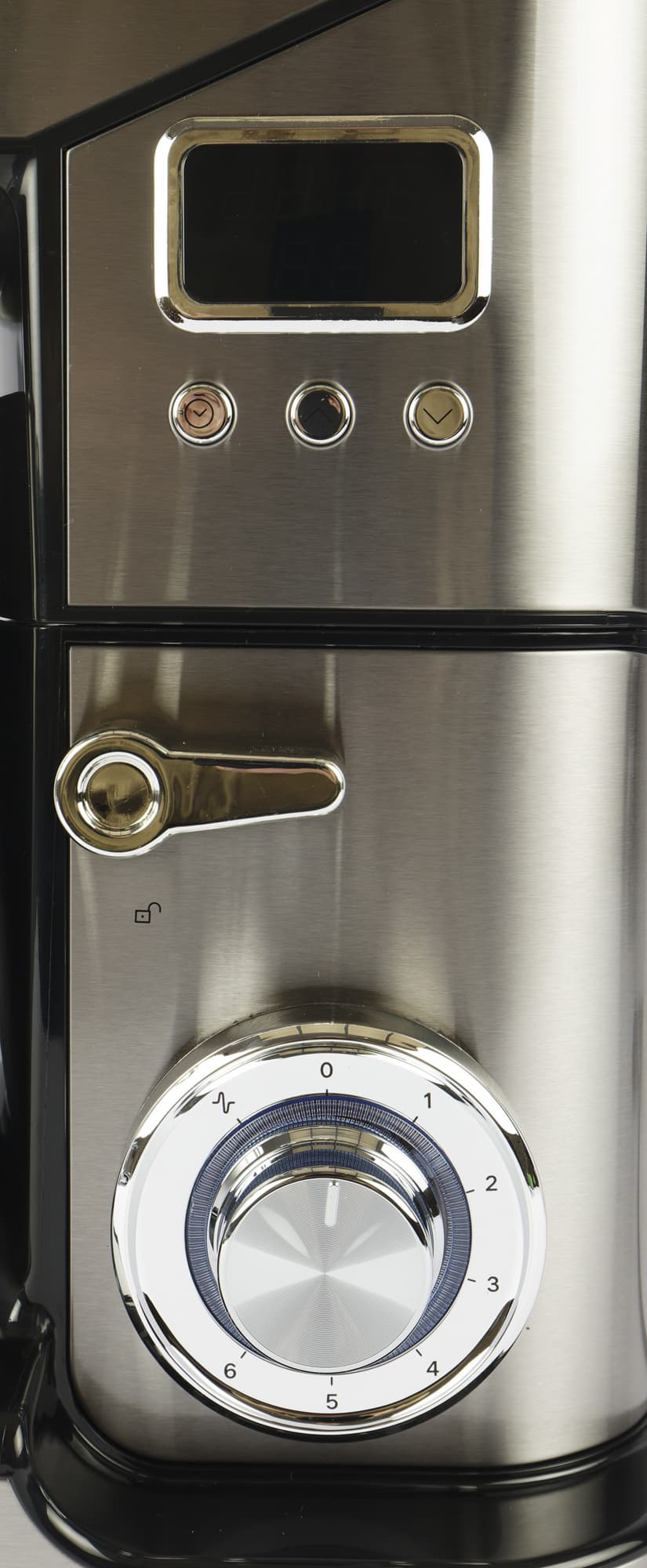 Корпус миксера с металлизированной отделкой. Гнезда для подключения блендера и мясорубки плотно закрыты заглушками.
