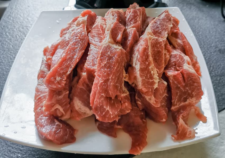 Для теста мы взяли мякоть свинины, разрезали ее на полоски, удалили жилки.