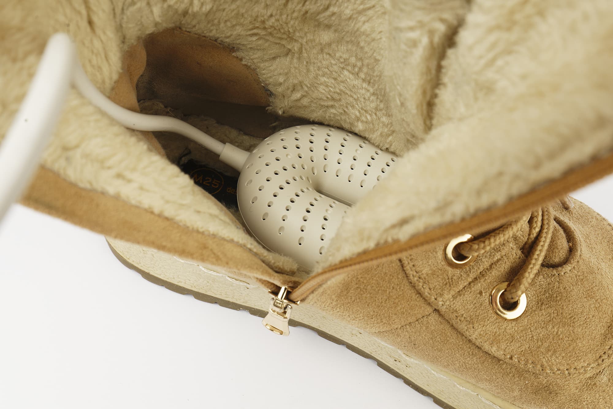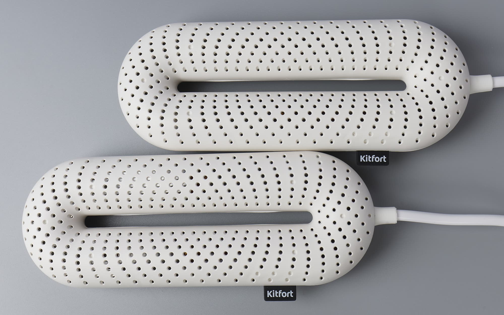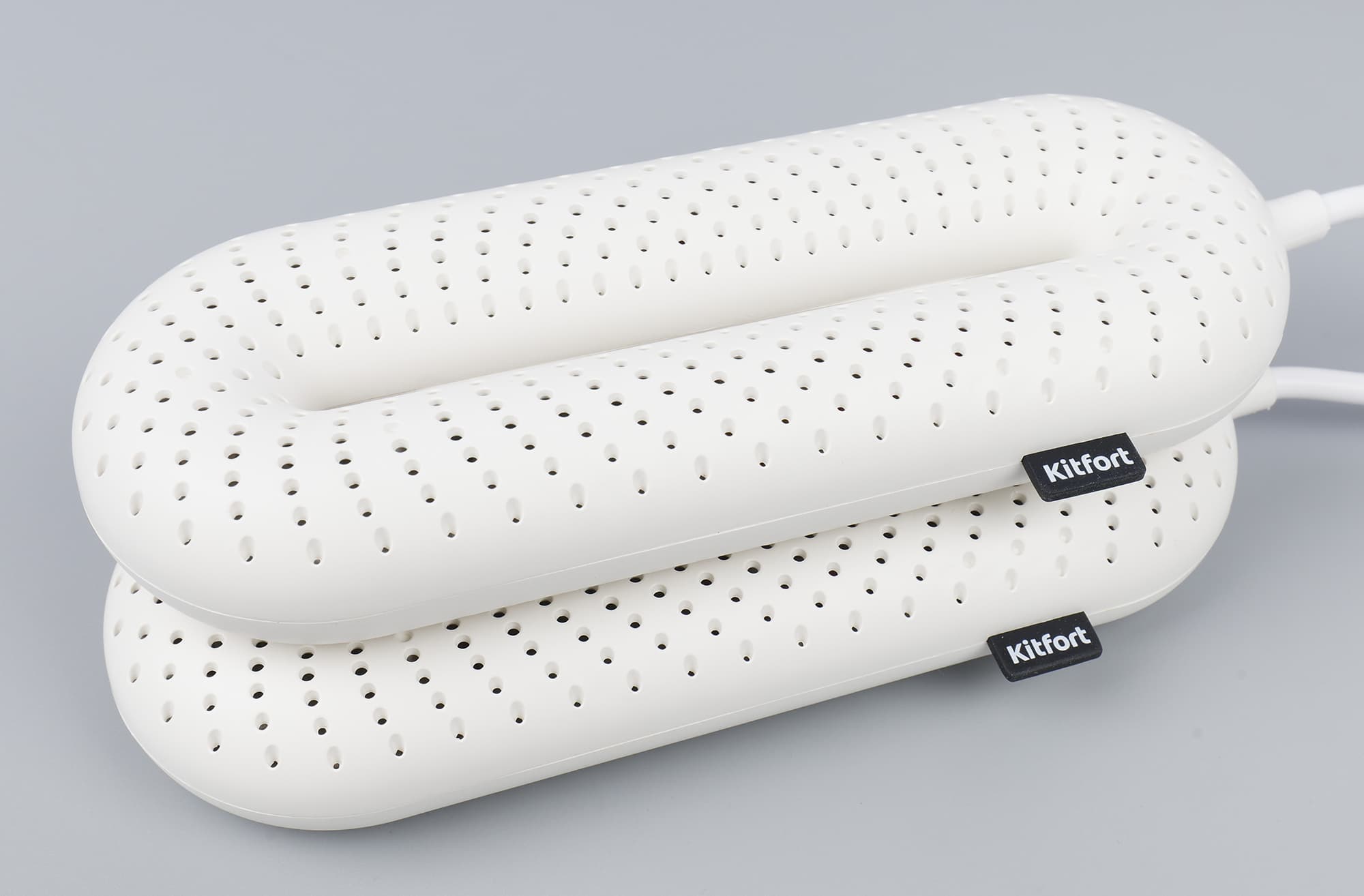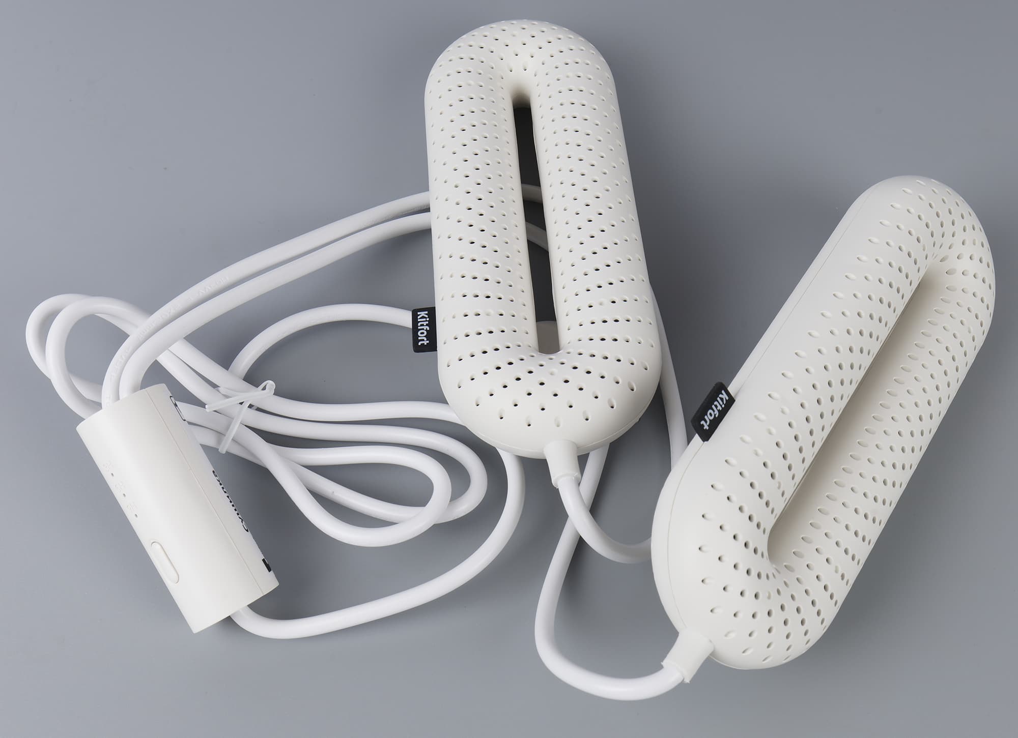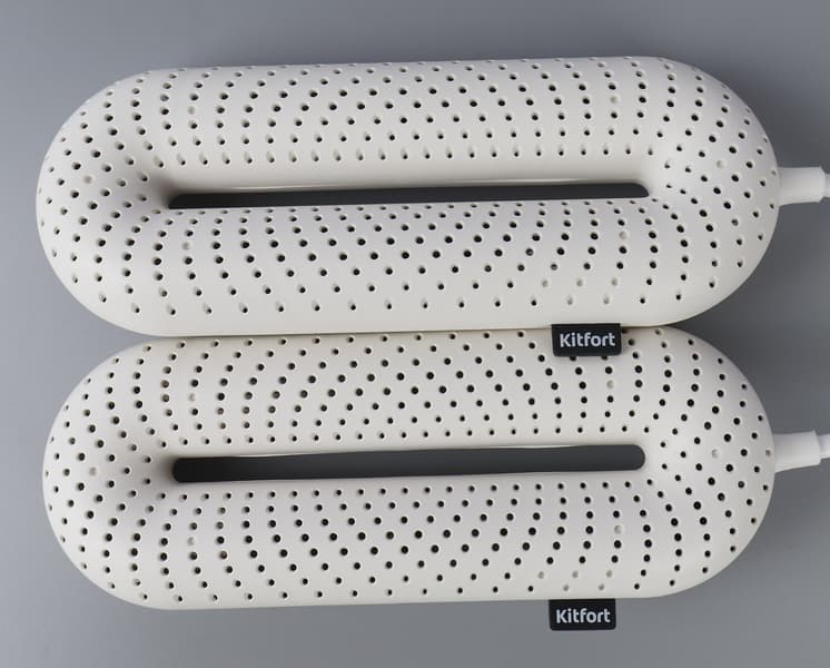 Сушилка для обуви KT-4014 состоит из двух округлых элементов из белого, приятного на ощупь матового пластика. Их соединяет электрошнур средней толщины.