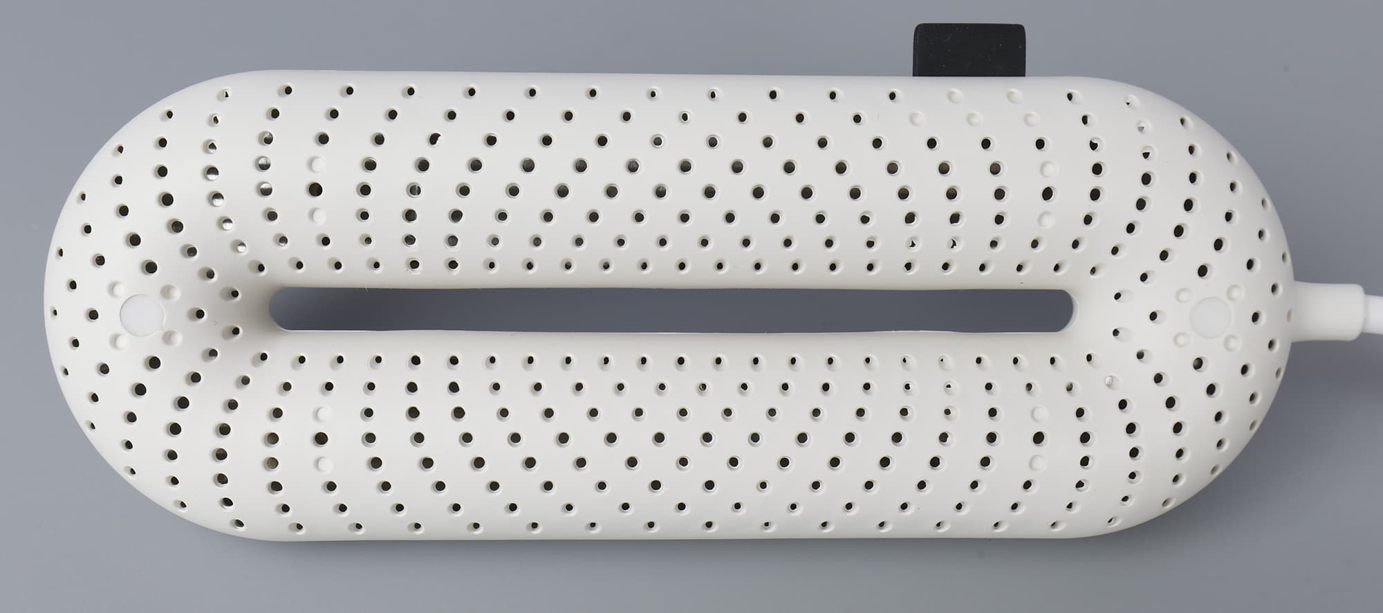 По всему корпусу устройства нанесены отверстия (производитель упоминает, что в каждом элементе их ровно 1532), которые позволяют равномерно распределять тепло по всему объему. Длина нагревателя — 170 миллиметров, поэтому его можно использовать с обувью от 27-го российского размера. У элементов нет выступающих частей, которые могут повредить внутреннюю поверхность: боковые «этикетки» с логотипом производителя выполнены из мягкой резины и не представляют угрозы для подкладки.