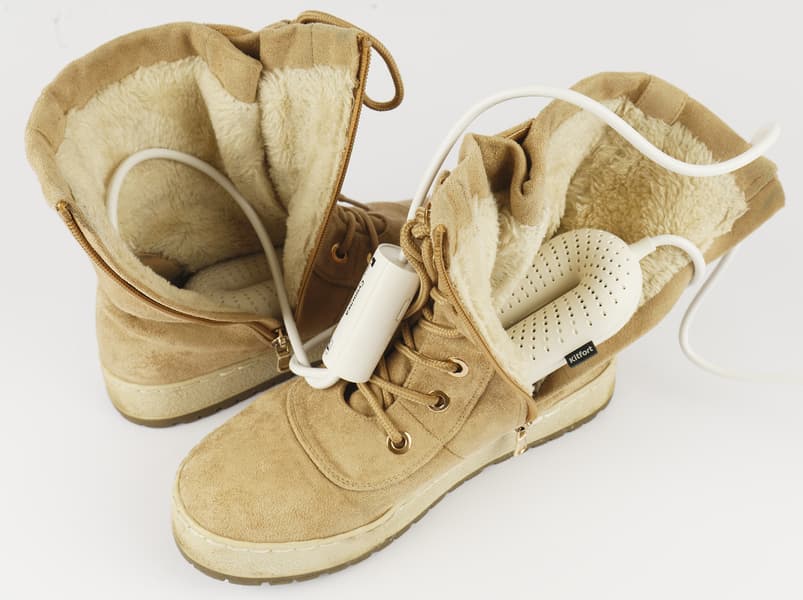 Для совсем мокрой обуви (это если внутри уже вода плещется) или одежды сушилку применять запрещается. Воду из ботинок (сапог или что там еще нужно высушить) следует вылить, отжать, если это возможно, или просто дать стечь лишней влаге — в общем, сделать из мокрой влажную. И только после этого включать прибор.