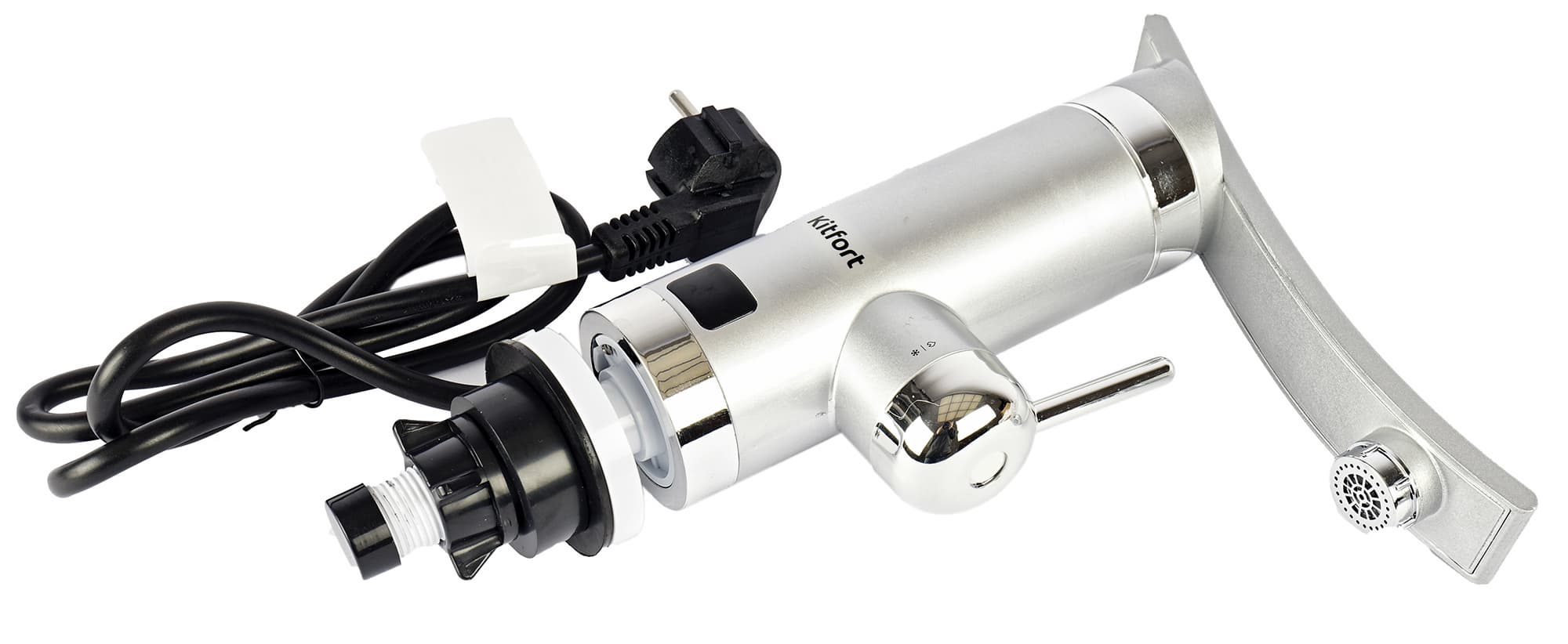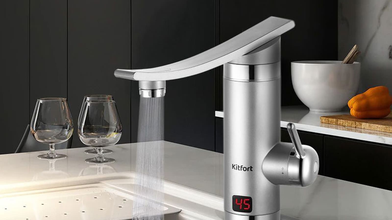 Kitfort KT-4028 сразу привлекает внимание современным дизайном и удобным форм-фактором: он компактен и очень похож на обычный смеситель. А вот удобно ли его инсталлировать и насколько хорошо он нагревает воду — узнаем при тестировании.