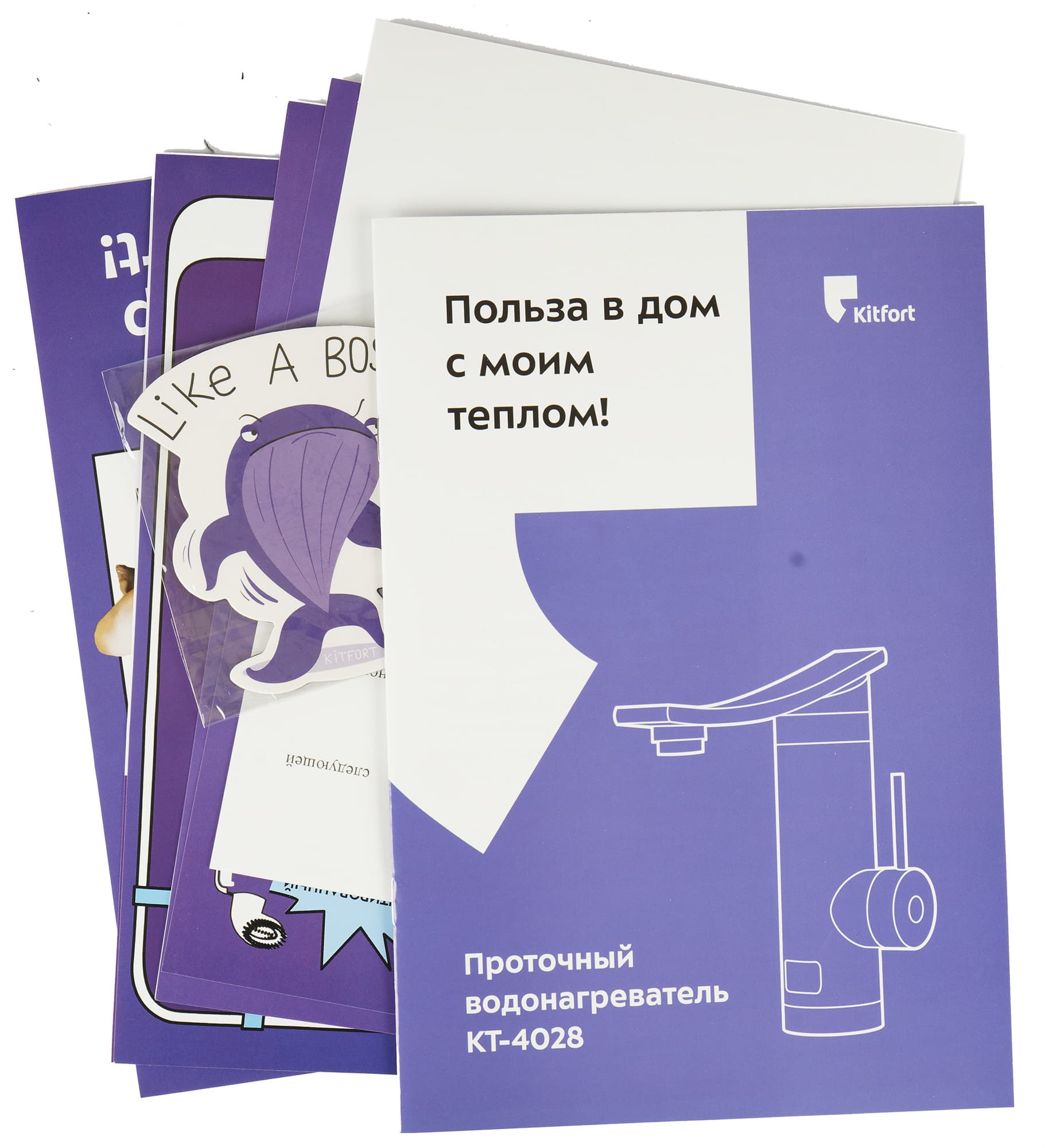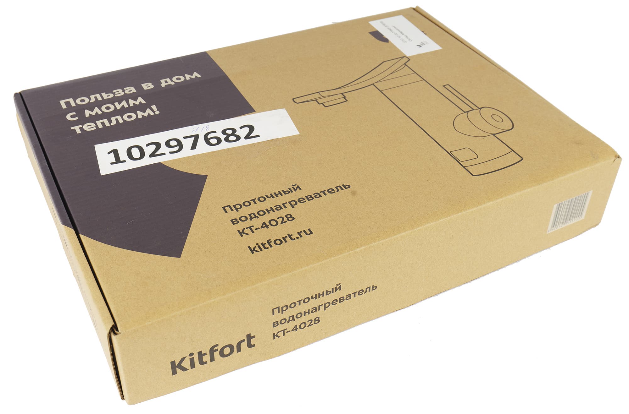 Водонагреватель упакован в плоскую картонную коробку, вид которой привычен для тех, кто часто покупает технику компании. На верхней крышке размещены схематическое изображение прибора, логотип производителя и обязательный слоган, свой для каждой модели бытовой техники Kitfort.