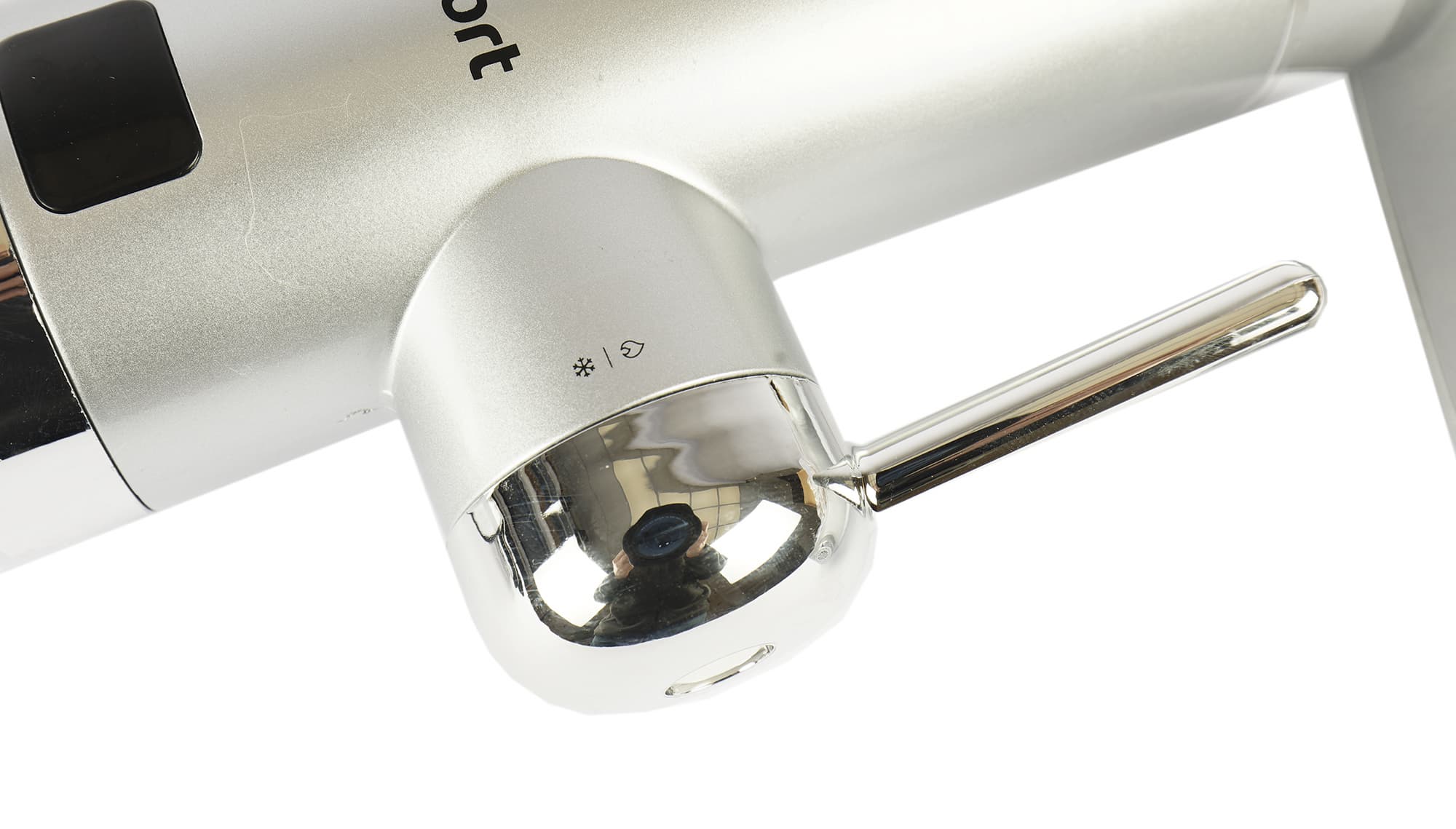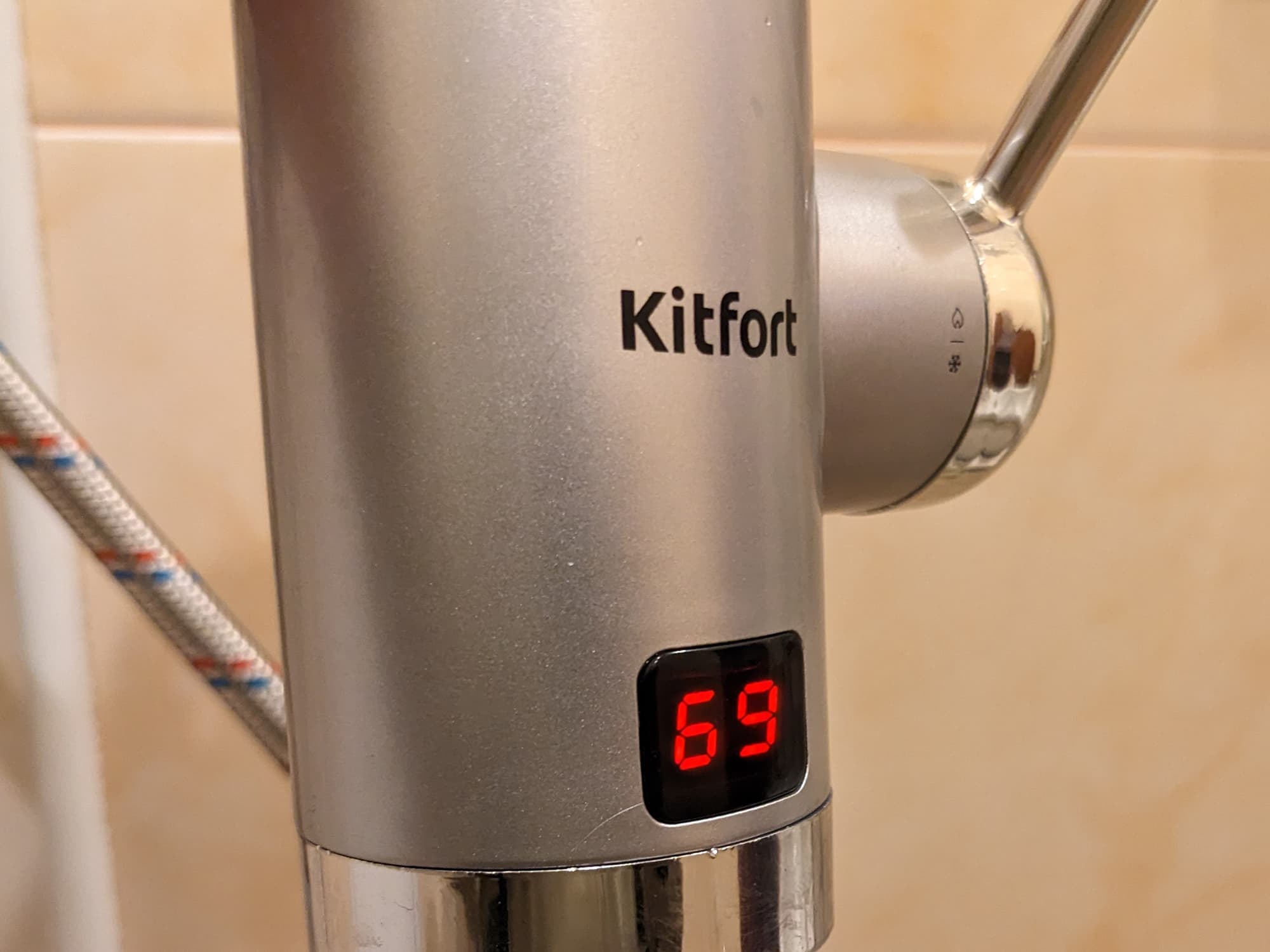 Перпендикулярно корпусу расположена ручка-регулятор: с ее помощью включается нагрев и настраивается температура воды — она отображается на дисплее из черного пластика. Управления мощностью в этой модели нет: температура изменяется за счет регулировки напора.
