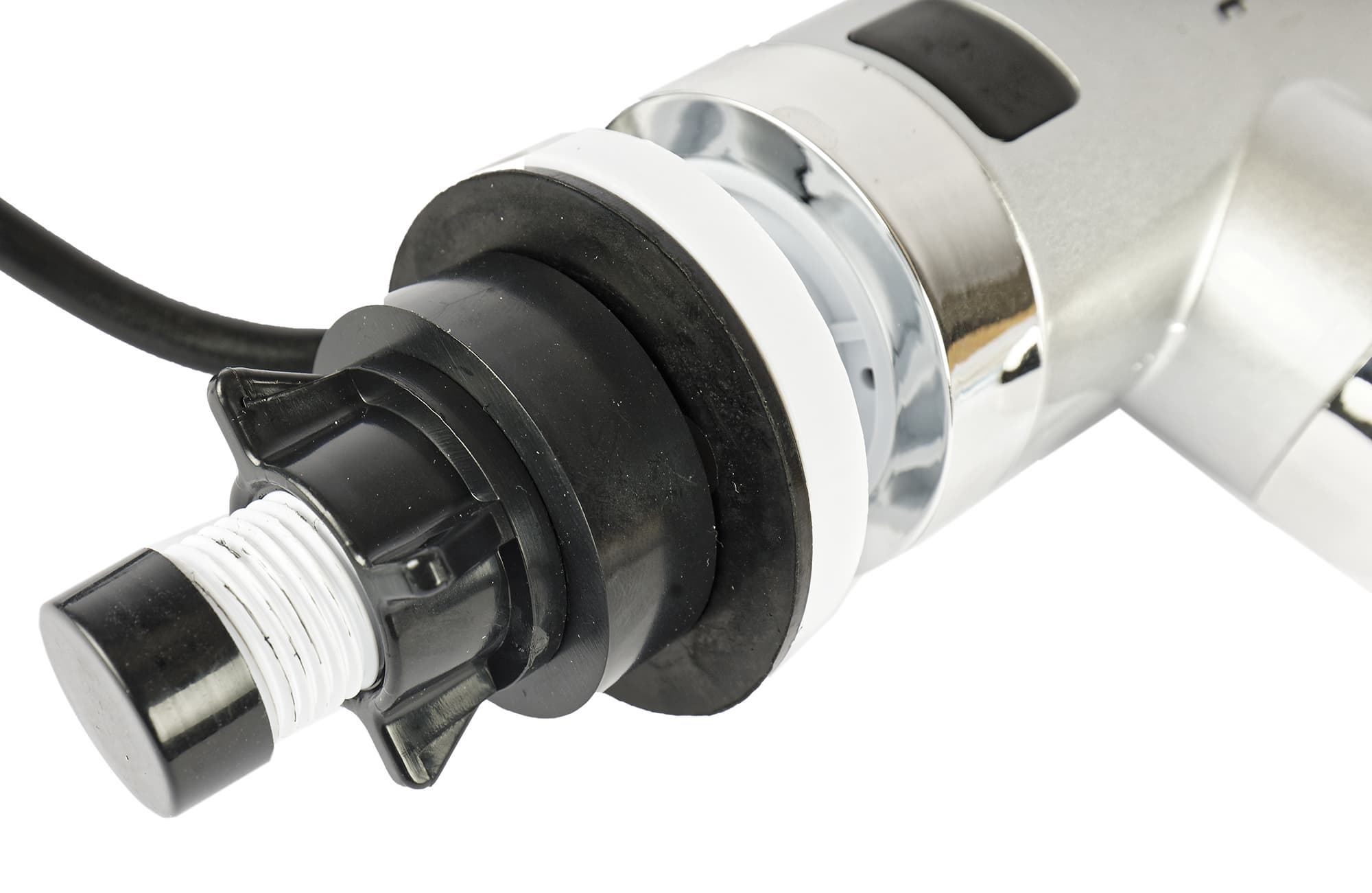 Водонагреватель устанавливается на раковину вместо обычного смесителя. Выше уровня поверхности остается корпус и белая пластиковая проставка. Снизу прибор поджимается шайбой и проставкой из черного пластика. В комплекте есть также крышка, защищающая резьбу при транспортировке.