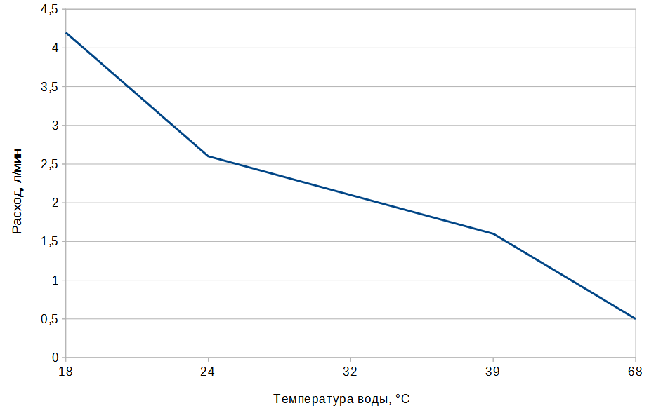 Максимальная температура горячей воды (68 °C) была достигнута при расходе около 0,6 литра в минуту, а минимальная составила 18 °C при полностью открытом (4,2 л/мин) кране.