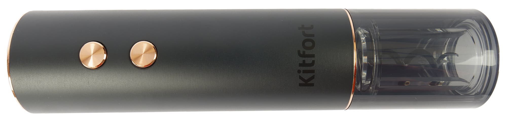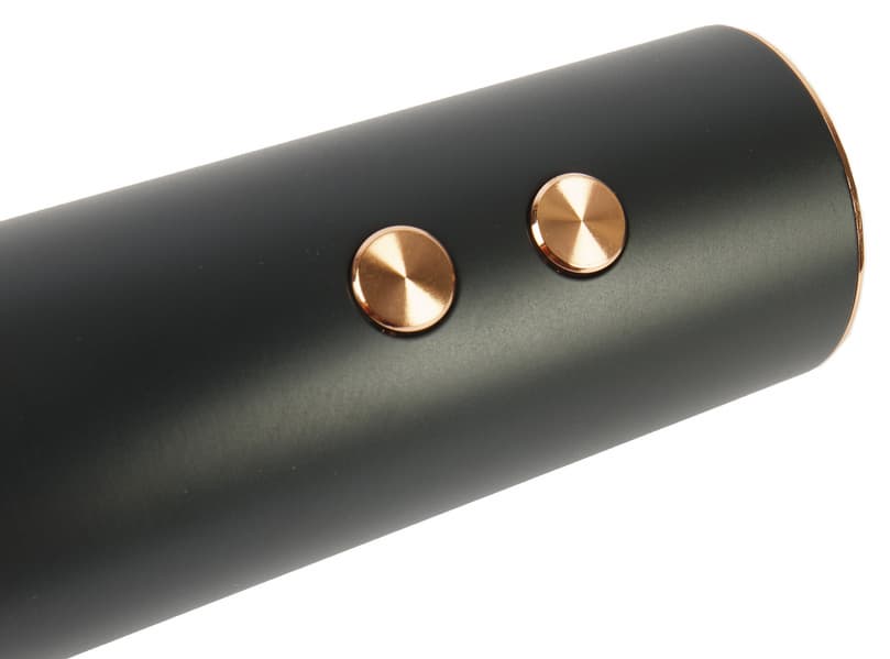 Корпус штопора выполнен из темно-серого матового пластика, а декоративные элементы и кнопки управления украшены металлизацией «под медь».