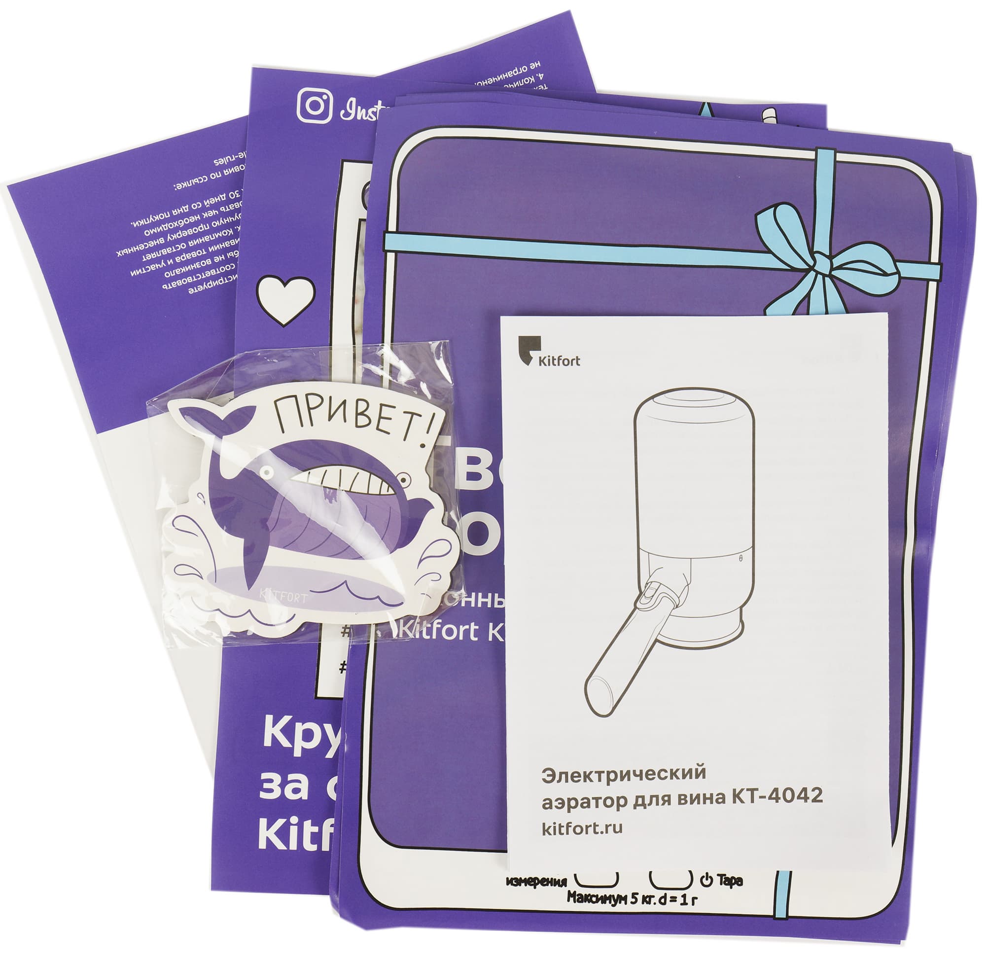 Черно-фиолетовая коробка Kitfort KT-4042 оформлена в уже знакомом нам фирменном стиле: векторное изображение устройства, название модели и обязательный слоган. Девиз, подобранный маркетологами для прибора, определенно намекает: для употребления напитка пользователю вполне достаточно компании аэратора.