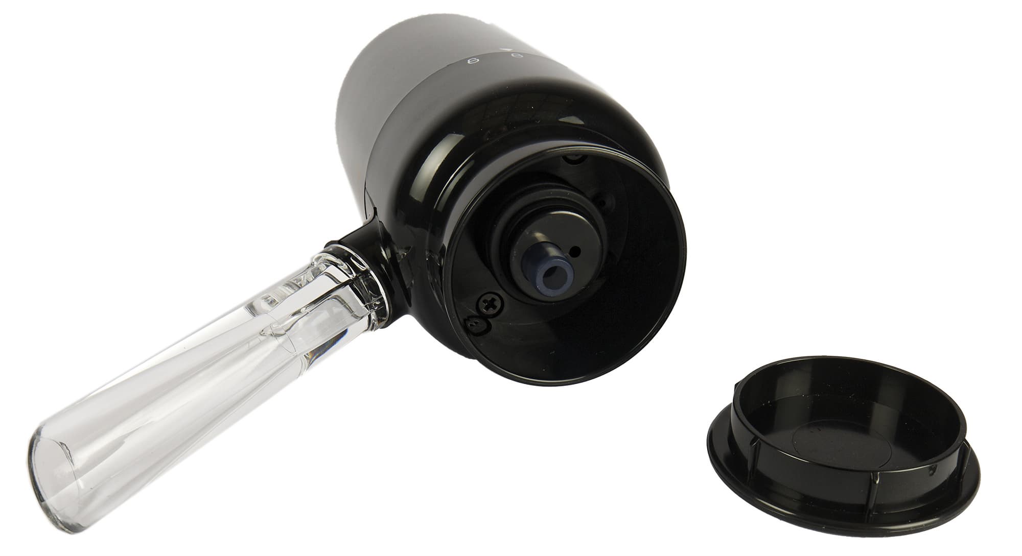 Отсек для пробки, внутри которой вращается спираль штопора, сделан из полупрозрачного серого пластика. Внутри смонтированы двухцветные светодиоды, подсвечивающие камеру при работе и зарядке.