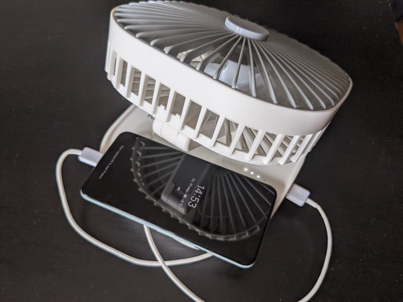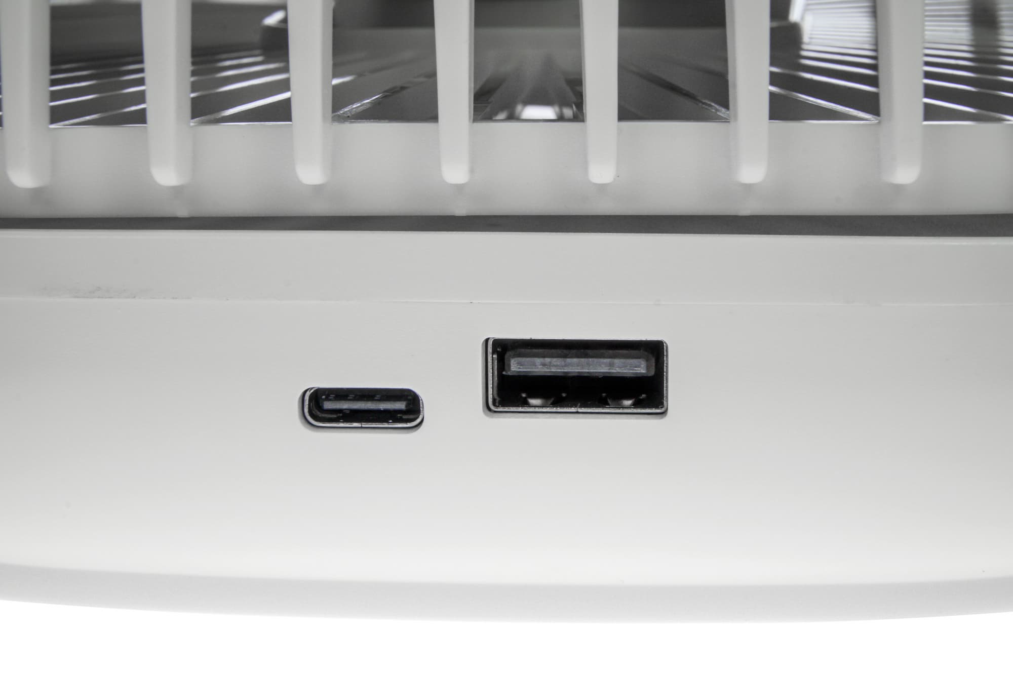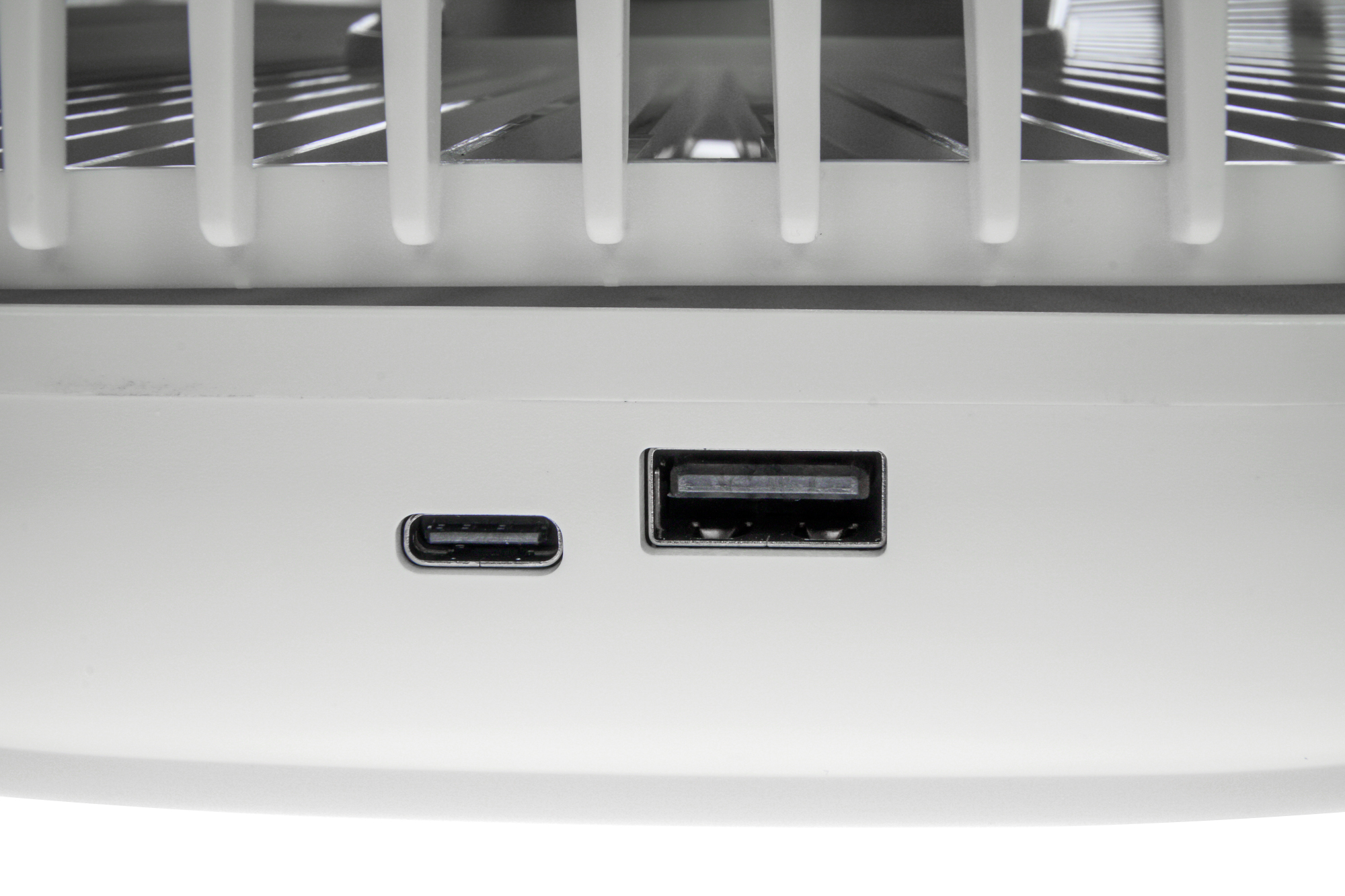 Чтобы включить прибор в режиме PowerBank, необходимо воспользоваться разъемом USB type-A на правом боку, подключив к нему нужное устройство при помощи соответствующего кабеля, и включить вентилятор. KT-404 начнет заряжать подключенное устройство, работая одновременно и по прямому назначению. Зарядка продолжится даже если выключить вращение лопастей. Производитель подчеркивает, что, поскольку выходной ток у KT-404 невелик, использовать его для полноценной зарядки не получится, но он может выручить в ситуации, когда других источников питания под рукой нет.