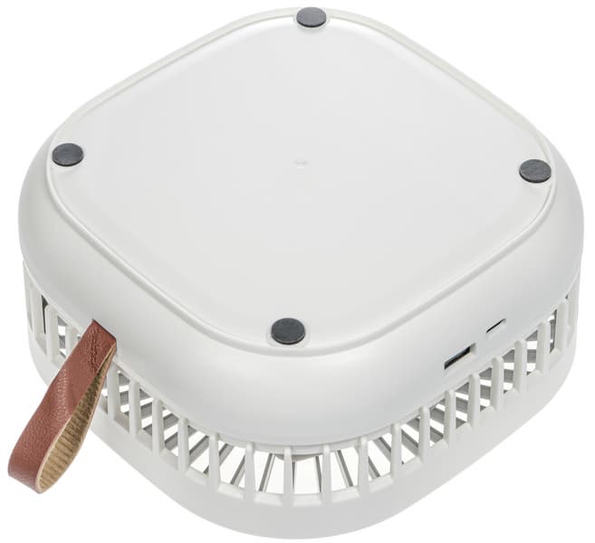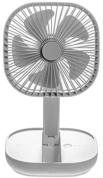 Единственная кнопка, управляющая устройством, находится на верхней панели основания. Первое нажатие включает вентилятор на минимальной скорости, последующие увеличивают скорость, а пятым нажатием прибор выключается. Выбранной скорости соответствует количество горящих светодиодов справа от кнопки — от одного до четырех. Если они мигают, это сообщение о низком заряде аккумулятора.