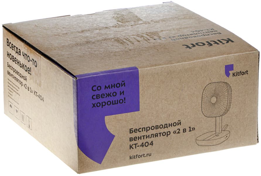 Модель KT-404 поставляется в коробке из крафтового картона, оформленной в традиционном для Kitfort фирменном стиле: на лицевой стороне производитель размещает векторное изображение устройства, название модели и рекламный слоган, единый для этой группы бытовой техники. На боковых сторонах содержатся краткие технические характеристики изделия, а на нижней грани — контактная информация производителя, импортера и организации, уполномоченной для принятия претензий.