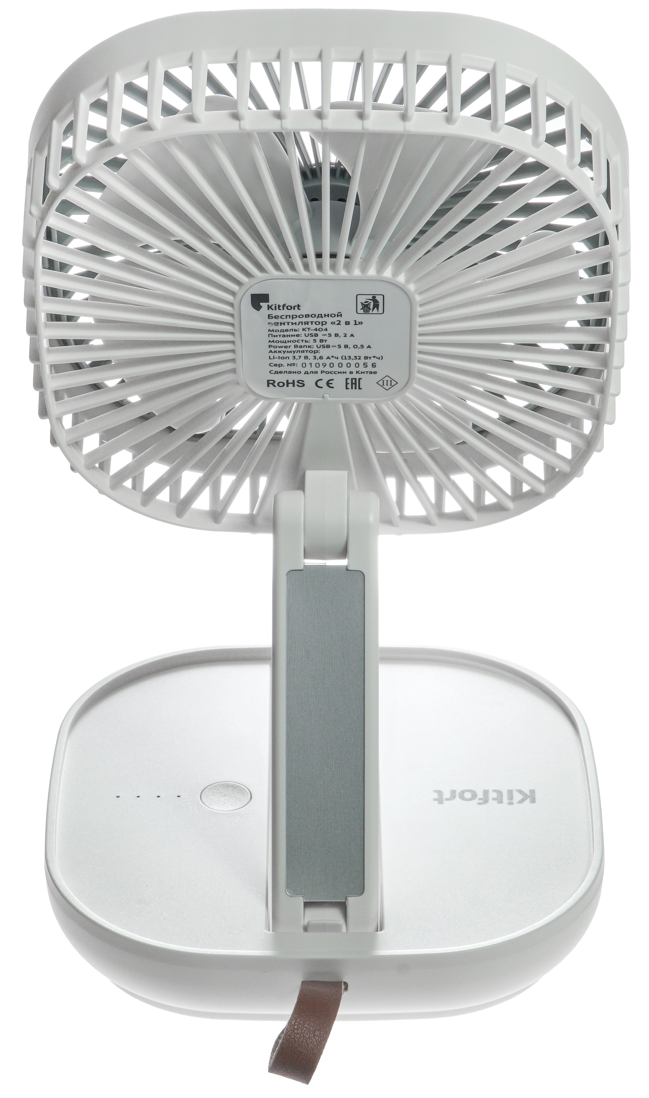 На верхней панели основания расположены кнопка управления и логотип Kitfort. В задней части к устройству крепится ременная петля из экокожи, за которую его можно подвесить на стену.