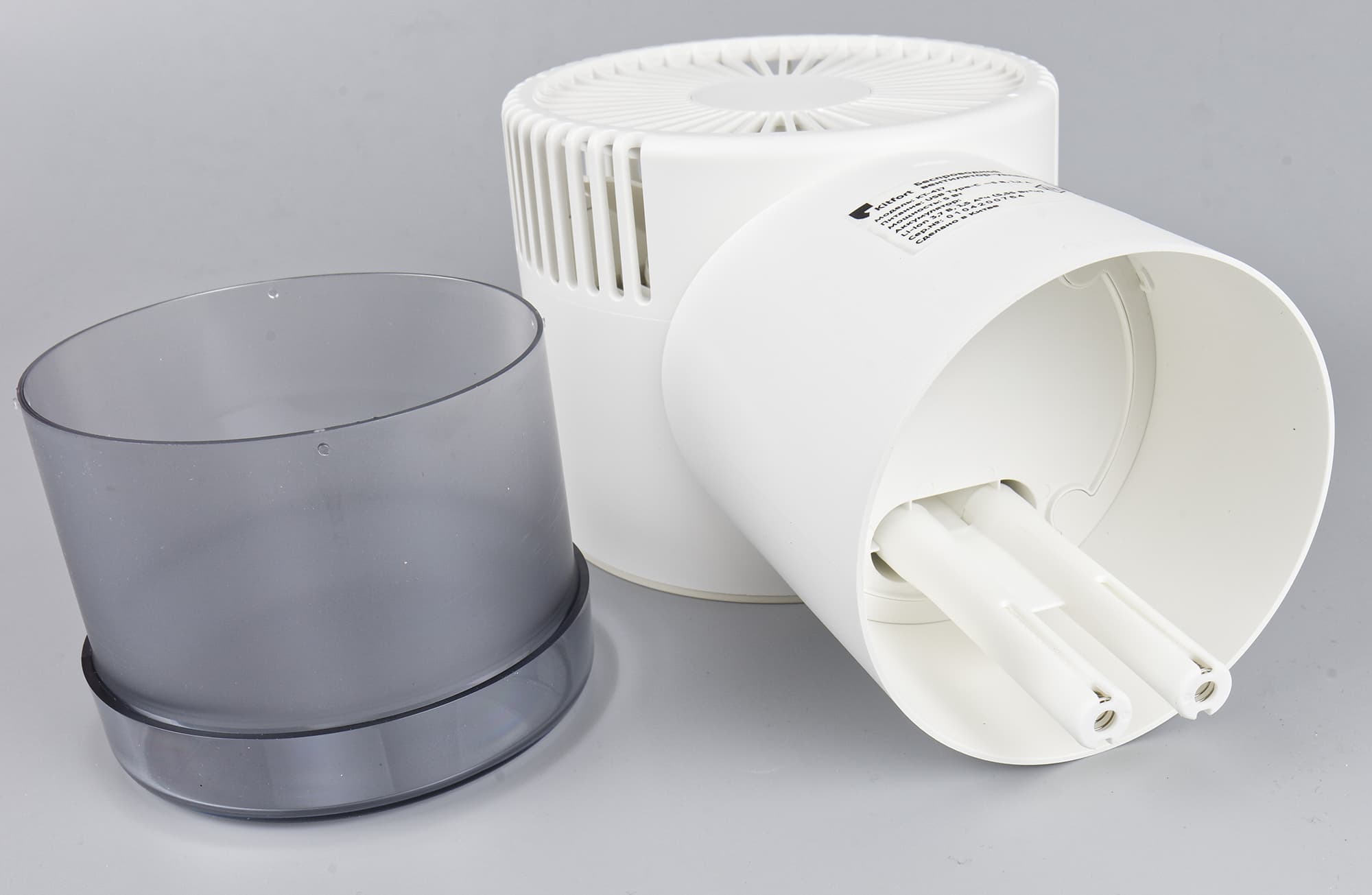 Оригинально решена система подачи жидкости из резервуара на ультразвуковые излучатели: внутри пластиковой вилки находятся два пористых элемента, играющие роль капилляров и поджатые снизу пружинками. По ним вода и поднимается наверх.
