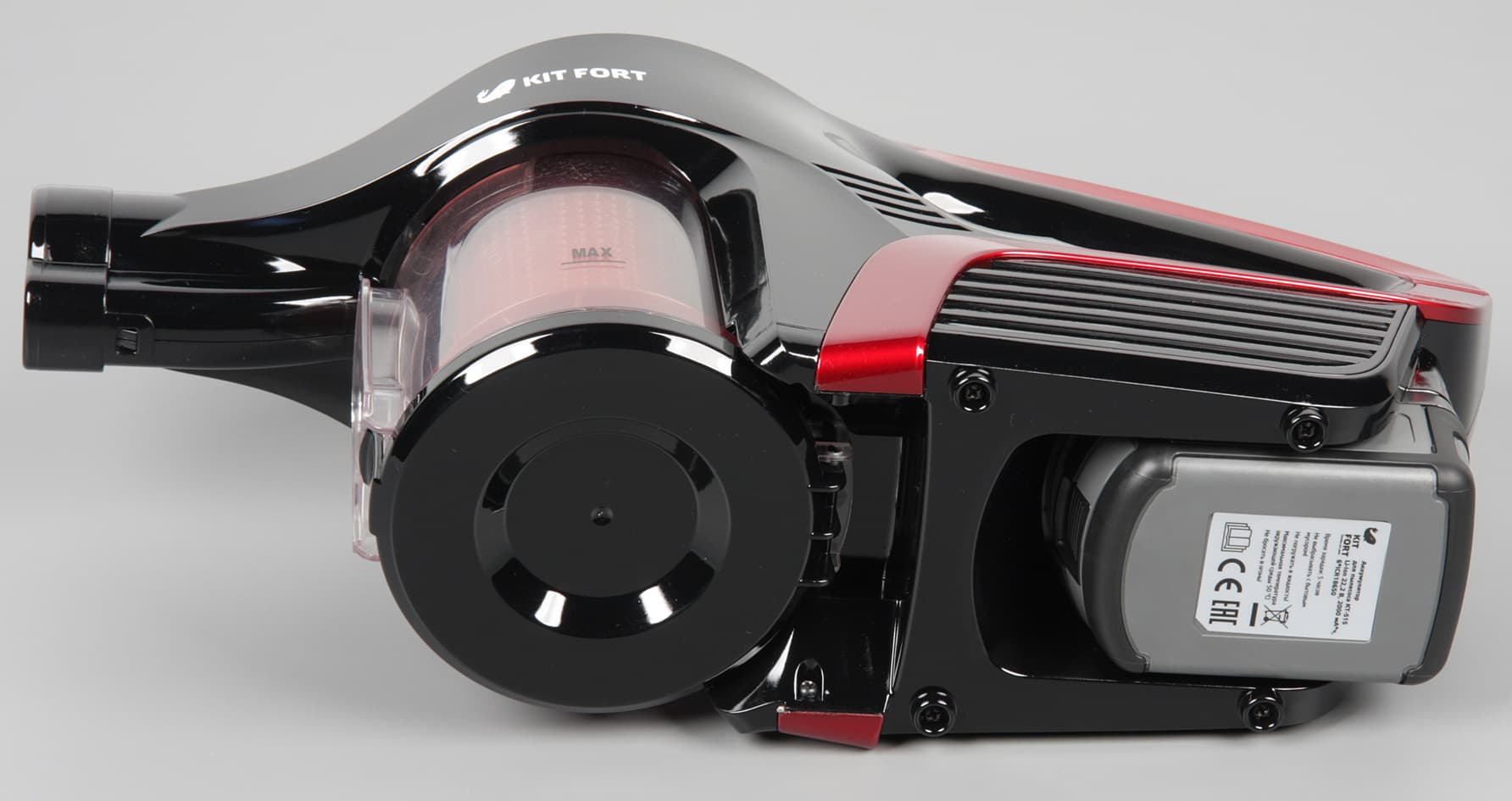 Остальные насадки и детали — в основном из черного пластика с матовой поверхностью и без покрытия. Стакан пылесборника — из прозрачного пластика, а внутренний стакан циклона — из красного полупрозрачного. Удлинительная труба относительно легкая, она двухслойная, внешняя оболочка изготовлена из алюминия, стенки внутреннего канала, видимо, тоже алюминиевые.